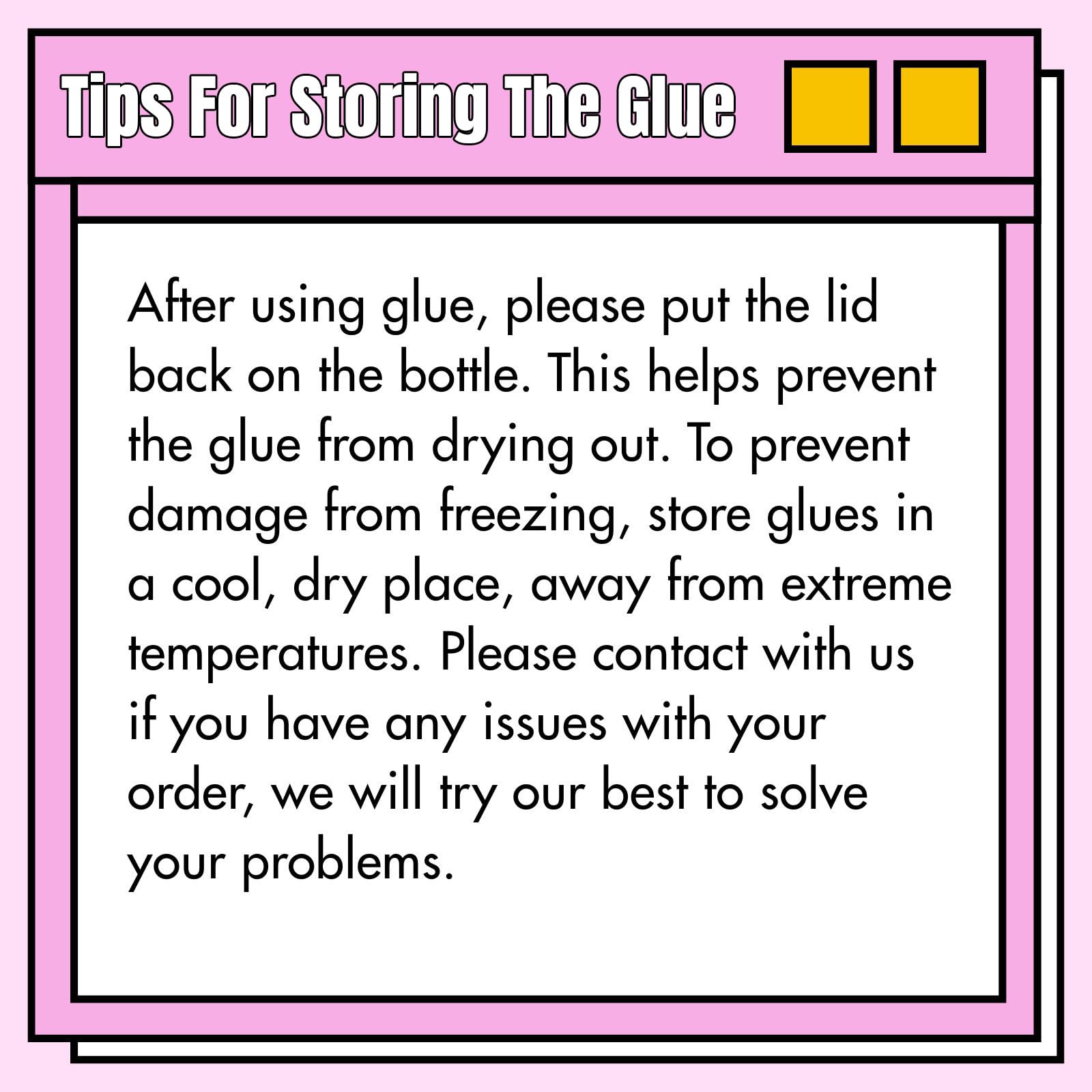 - Tips for storing the glue: After using glue, it's important to immediately put the lid back on the bottle or tube. This helps prevent the glue from drying out, hardening, or becoming contaminated. To prevent damage from freezing, store glues in a cool, dry place, away from extreme temperatures. Please contact with us for any issues with your order, we will try our best to solve your problems.