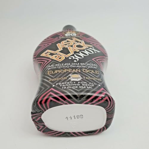 Details: Product details Glow like never before and keep all your tattoos looking bold with European Gold flash black 3000x indoor tanning lotion from creative laboratories. This 12-fl oz bottle of salon formula indoor tanning lotion features a nozzle that's easy to press open, allowing you to squeeze out the perfect amount of lotion for each tanning session. Featuring a gentle fragrance to invigorate your senses, this lotion is designed for use in all types of tanning beds, this lotion is formulated with advanced, time-released DHA bronzers that continue to develop your tan long after you leave the salon and leave your skin with a remarkably deep, natural-looking tan. A special tattoo-enhancing serum contains hemp seed oil and other botanical extracts to help keep your tattoos looking as bold and beautiful as your tanned skin, so you can nail the perfect dark look all year round. Using this lotion is easy simply apply it liberally before your tanning session, lay back, get comfortable and enjoy gorgeous, long-lasting results. European Gold Flash Black 3000X Ultra Dark Tanning Lotion, 12 fl oz: This salon formula tanning lotion adds extra depth to tanning bed sessions for dark skin and bold tattoos 12 fl oz size. Bottle with a convenient press-open nozzle for quick, mess-free application Contains coconut, olive, sunflower, and hemp seed oil to nourish skin and enhance tattoos, also contains açai palm, sweet orange, Tahitian gardenia, walnut shell, and bupleurum falcatum root extracts Time-released DHA complex bronzers develop a tan even after you've left the tanning bed Contains tattoo-enhancing serum to keep tattoos bold and clear Not tested on animals