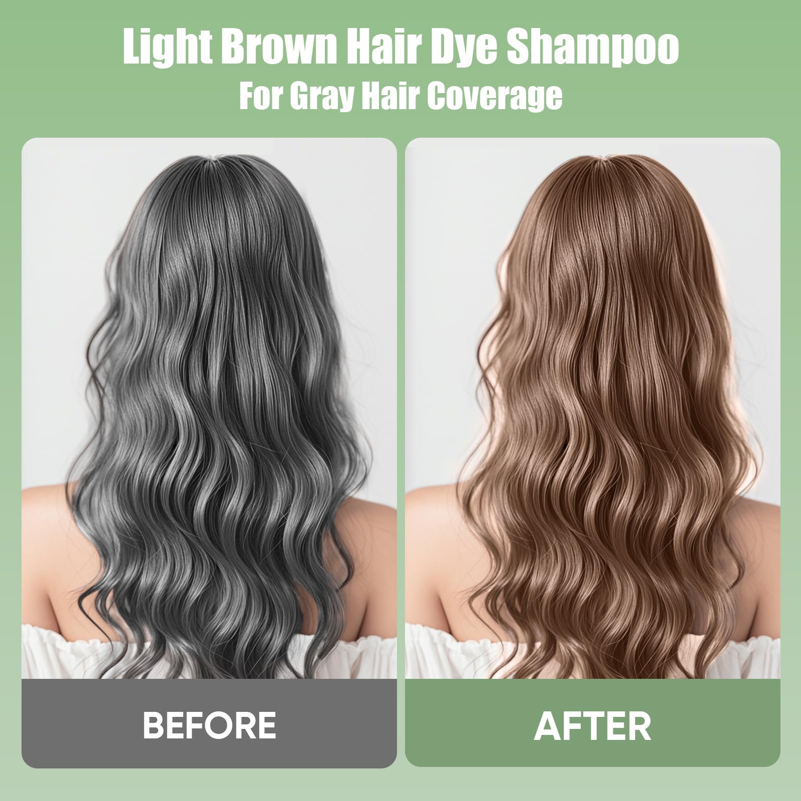 - ✔100% Gray Coverage: Wave goodbye to stubborn grays! Our light brown hair dye shampoo delivers full coverage in just 10–15 minutes, restoring your hair’s youthful shine and confidence. No more salon trips—just salon-worthy results!