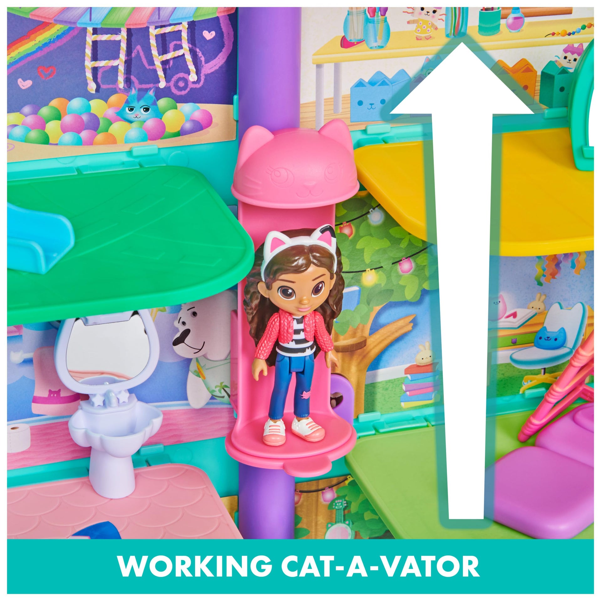 - OVER 2 FEET TALL: With its cat-inspired shape and colorful details, Gabby’s Purrfect Dollhouse looks just like the one from the show. It’s the ultimate setting for your exciting pretend play adventures