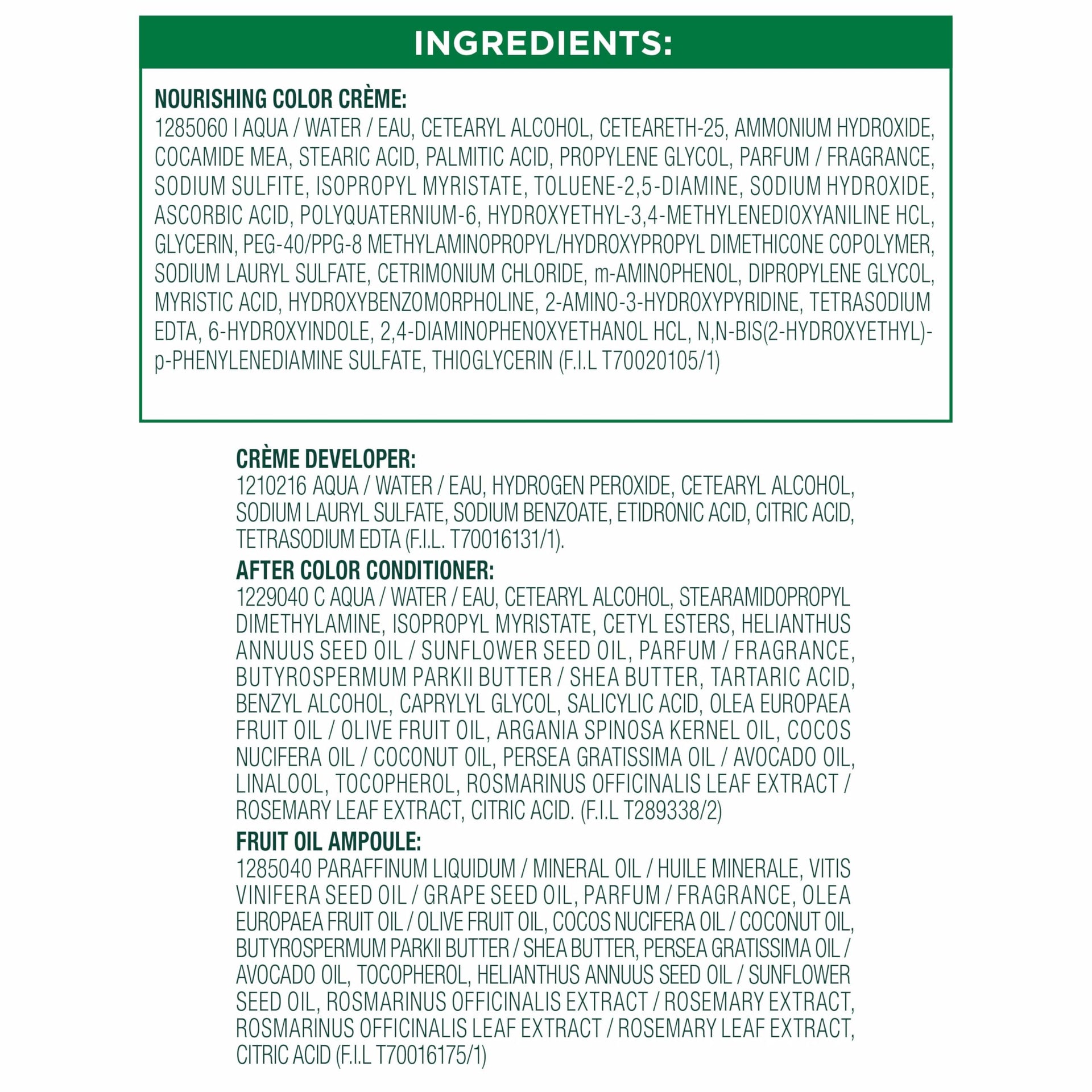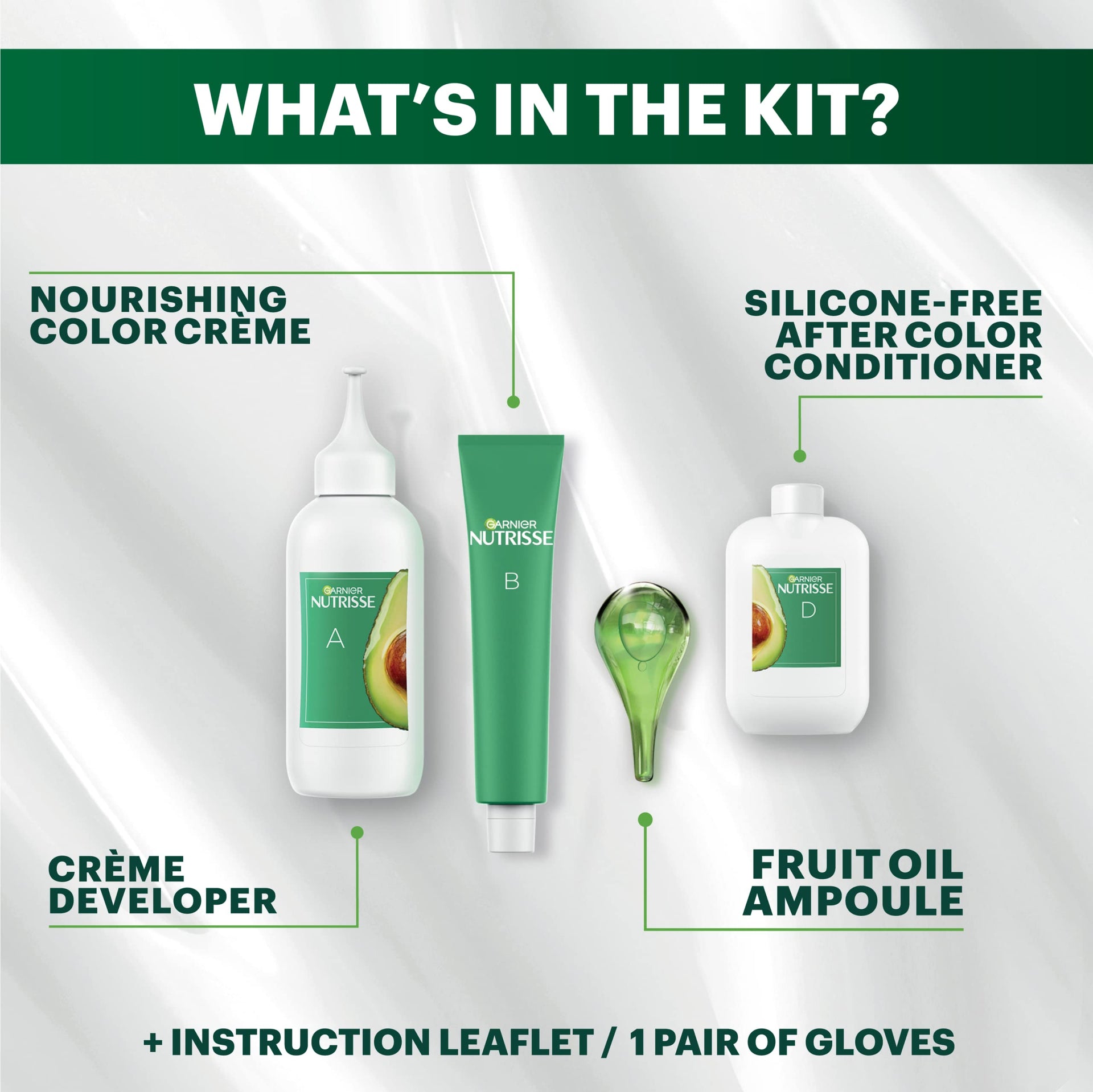 Details: Garnier Nutrisse is the only permanent hair color creme that nourishes while you color with avocado, olive, coconut, argan, and shea oils. The nourishing color creme enriched with fruit oil concentrate, penetrates deep into hair fibers to nourish and condition your hair so it takes color better and holds it longer, root-to-tip. Garnier Nutrisse delivers rich, radiant, long-lasting color with 100% gray coverage.