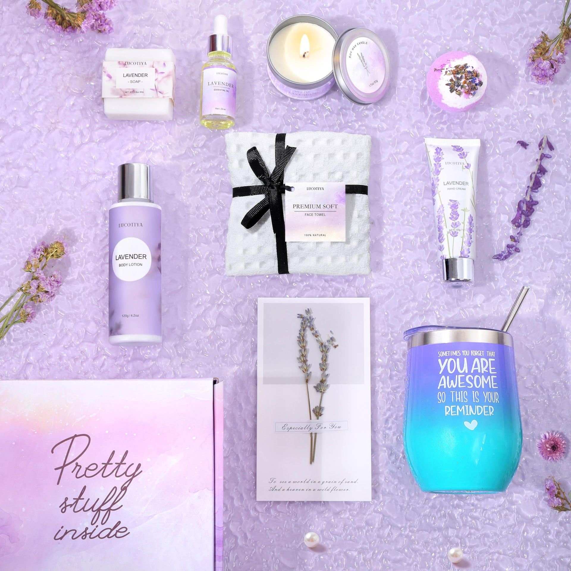 - 10Pcs Home Bath Gift Set for Women: This spa gift basket has everything a woman needs! Each set comes with: Purple Tumbler 12oz capacity, Hand Cream 1.7oz/50g, Body Lotion 4.2oz/120g, Lavender Candle 1.7oz/50g, Lavender Soap 2.8oz/80g, Bath Bombs 3.8oz/110g, Lavender Essential 20ml, Face Towel11.8x11.8 in. Packed in a stunningly wrapped in a gift box .Our spa baskets are perfectly sized for gift giving.