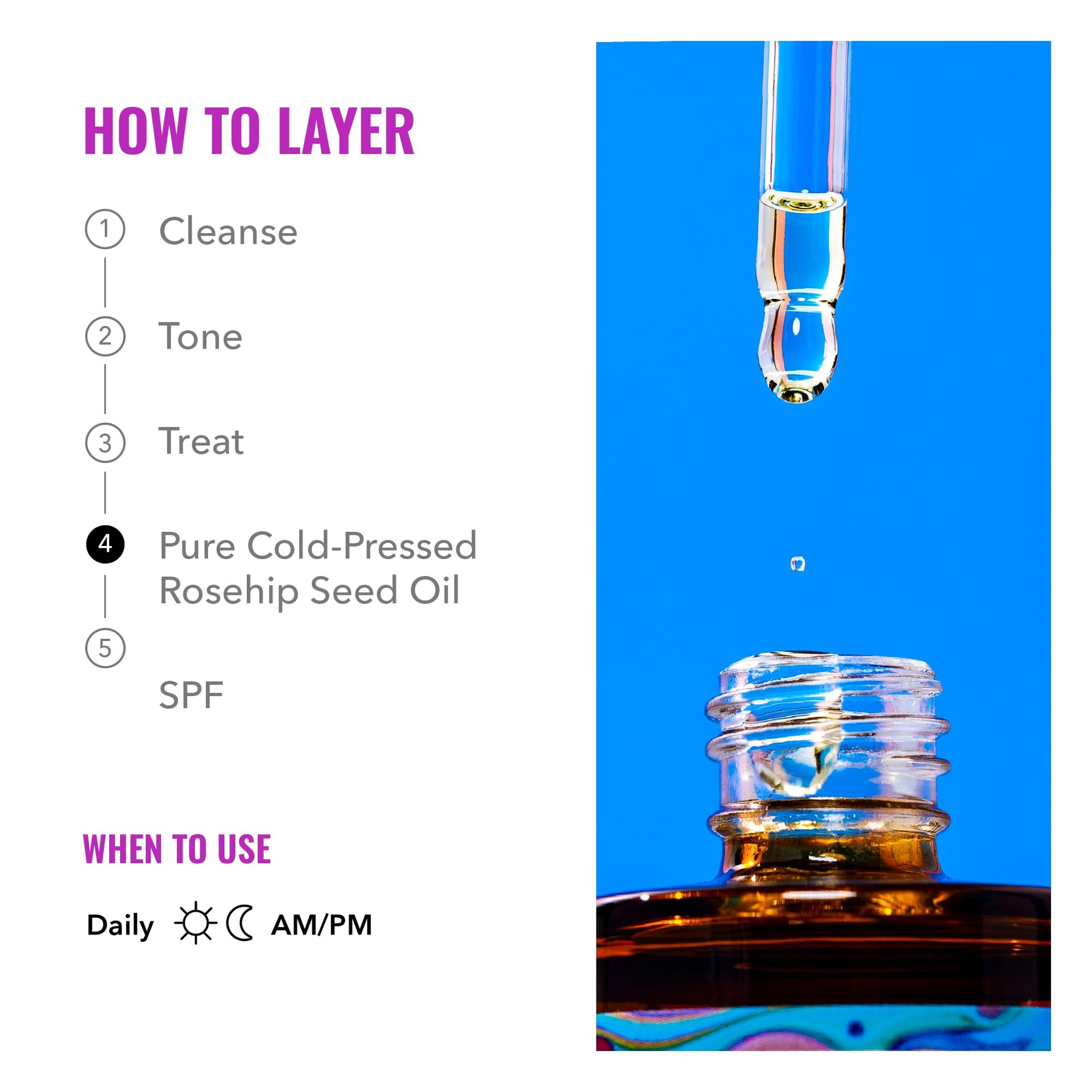 This hydrating oil is suitable for all skin types and gentle enough for daily use. Simply warm a few drops between palms and gently press into damp skin. When used with other products it is best absorbed after water-based serums. Our oil contains no additional additives or irritants - just 100% Pure Rosehip Seed Oil!