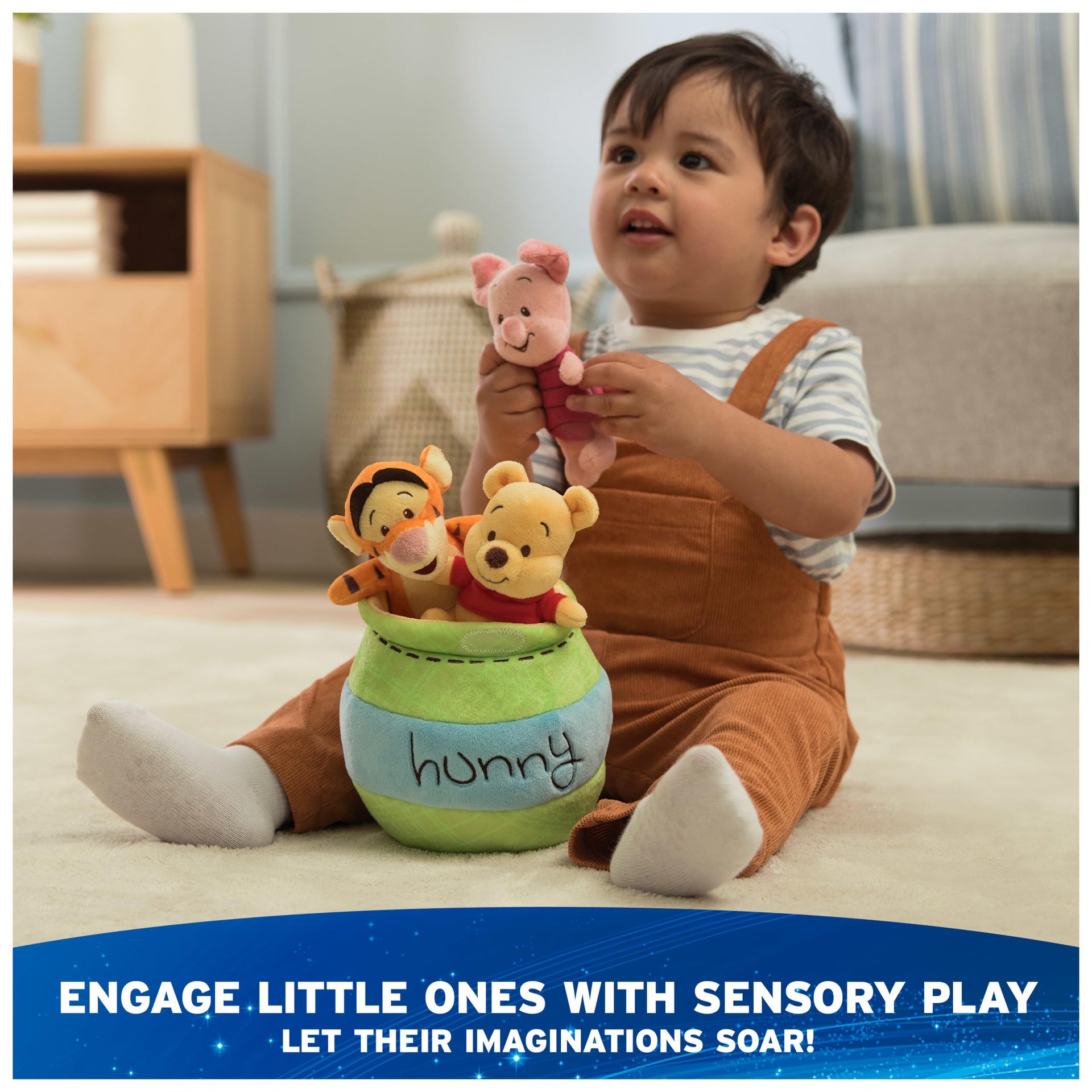 - WINNIE THE POOH PLUSH PLAYSET: Bring your favorite Disney characters to playtime This soft playset features an 8” plush honey pot which neatly stores 3 soft sensory toys: a Winnie the Pooh rattle, a Tigger squeaker, and a crinkling Piglet plush