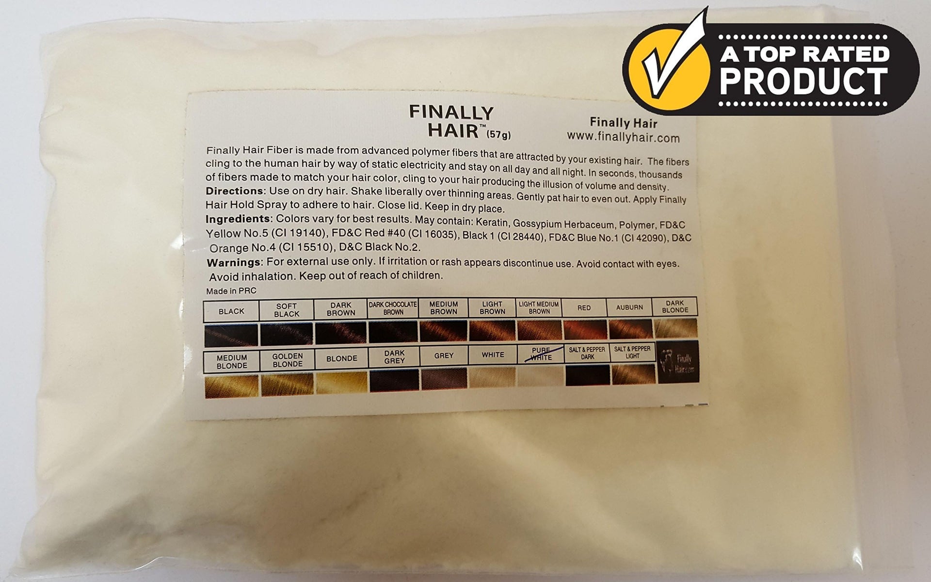 Details: 57 Gram Refill - THE BEST HAIR FIBERS ON THE MARKET Real Keratin Fibers - No cotton or fillers like many others. Most Applicator Bottles reopen. See our pictures to see how Finally Hair bottles open. Anti-Clump Formula - Doesn't clump up or absorb moister and get fat. Clean Pillow Formula - Hardly comes off when used with standard hair sprays like Finesse. Easy To Apply - Applicator bottle makes it very easy to apply. Try the rest? This is the best. Highest Quality On The Market! Also available in Black, Dark Brown, Medium Brown, Light Brown, Blonde, Medium Blonde, Grey, and Red Suggested Retail $59.97 THIS IS A REFILL AND DOES NOT INCLUDE THE APPLICATOR CAN. SEARCH AMAZON ON "Finally Hair" TO SEE OUR REFILLABLE APPLICATOR CAN THAT INCLUDES 28 GRAMS OF FIBERS.