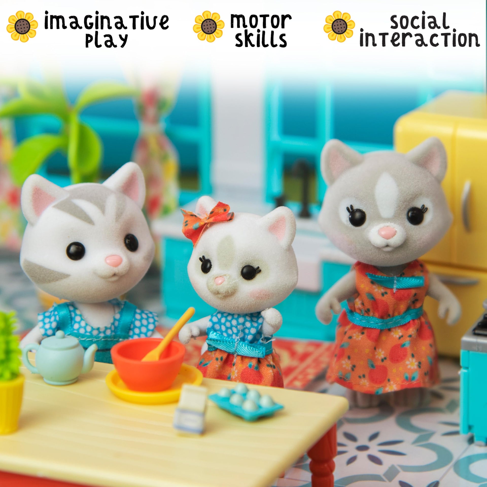 - The toy set includes 4 miniature flocked cat characters: 2 parents and 2 kids