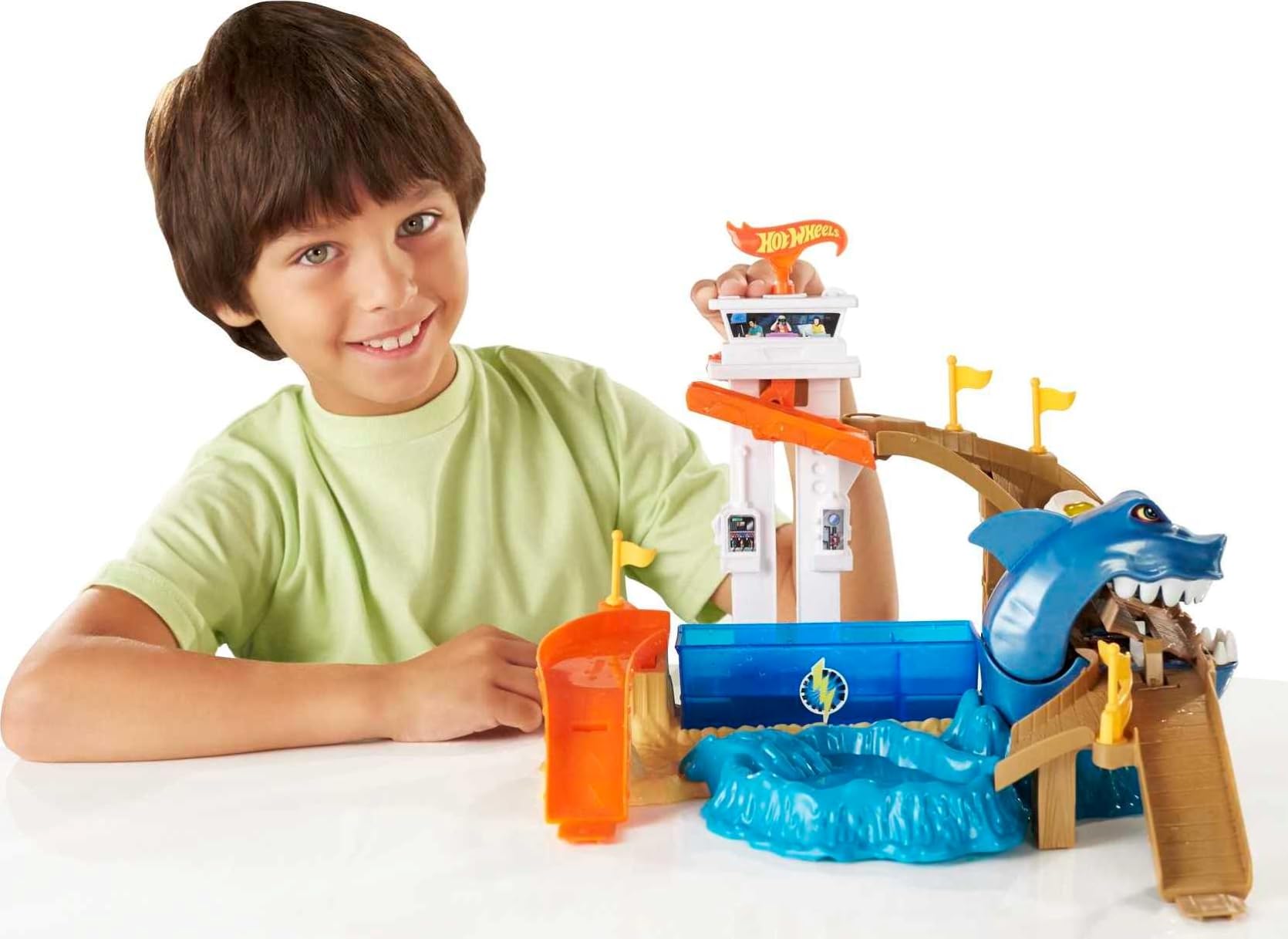 Hot Wheels Color Shifters Shark Splashdown Trackset: This shark chomps cars. Race on the track, change colors and defeat the shark. Ejector launches cars off the track. 2 color-change zones for twice the fun. Includes trackset and 1 car.