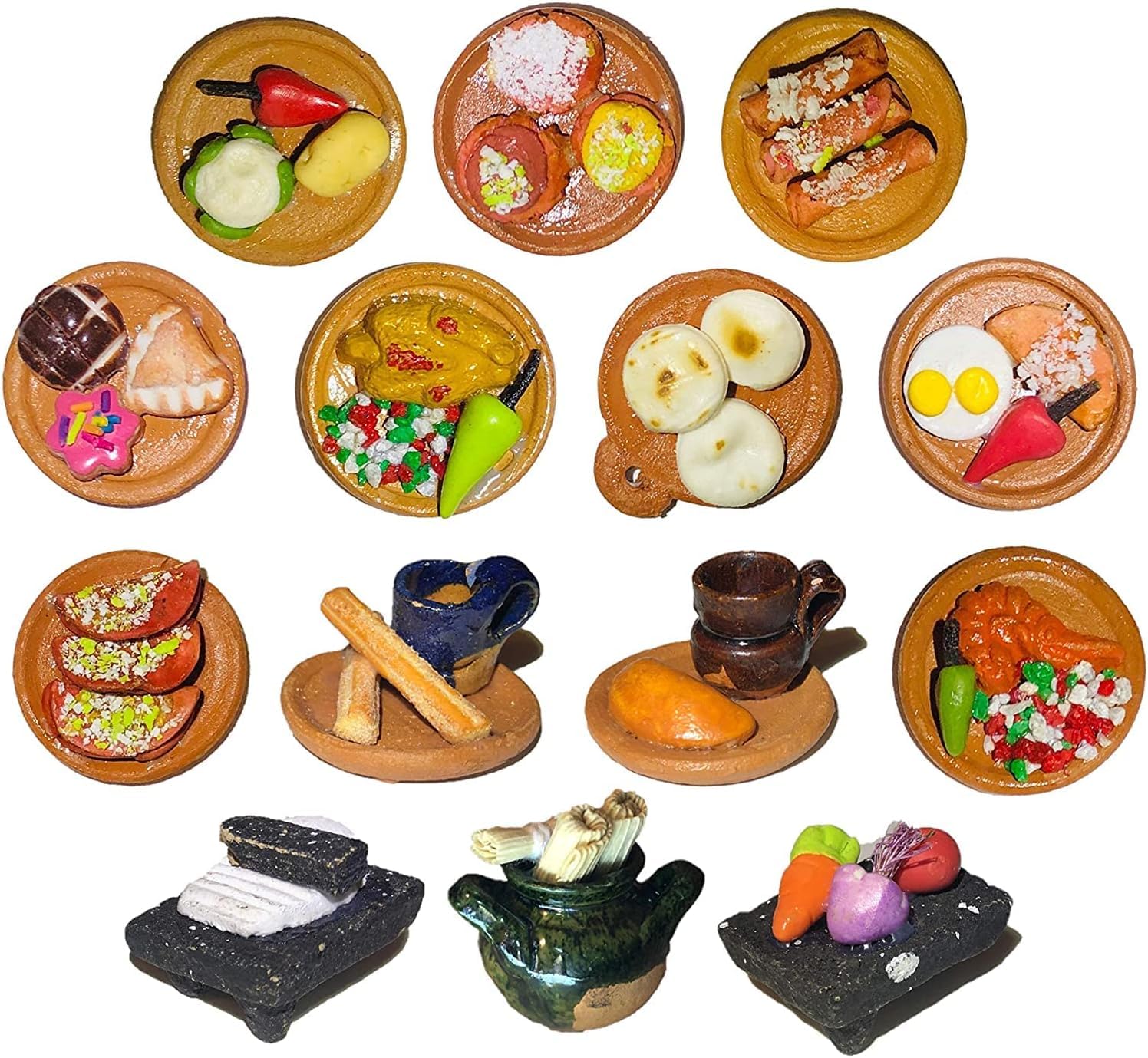 Details: Mexican Artisans measures 4 cm diam. for convenient use. Food and miniature Mexican artisan perfect for Dia de los Muertos altars. Food and other offerings are essential on any Day of the Dead altar and these miniatures are perfect for a tiny ofrenda. There are several dishes that are commonly associated with Day of the Dead such as tamales, rice, mole, chocolate, fall fruits, pumpkin desserts, and pan dulce. Festive plates are left out and I also meant to satisfy hunger after a long journey to the living world.