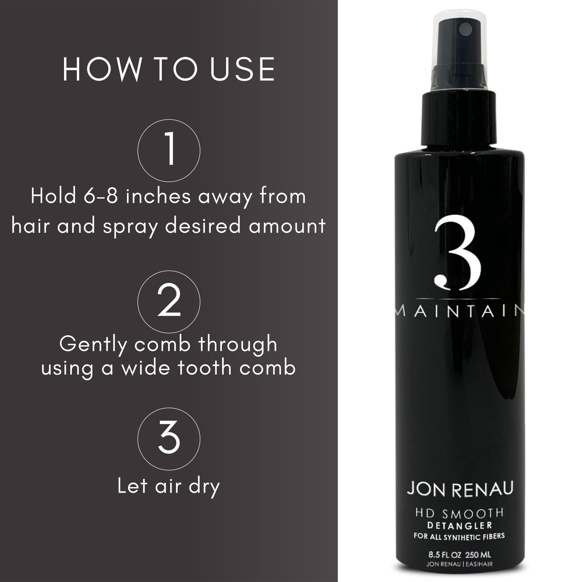 Details: Enhance and prolong the beauty of synthetic wigs and hair extensions with easy-to-use HD Smooth conditioning detangler. Spray it on and comb through to eliminate tangles and frizz while restoring healthy luster and body. TO USE Hold 6-8 inches away from hair and spray desired amount. Gently comb through using a wide tooth comb. Let air dry.