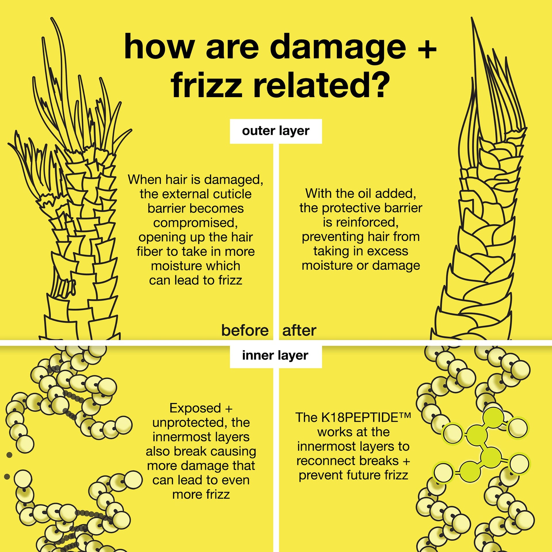 - works on all hair types to strengthen, repair damage & improve shine at two levels of the hair fiber