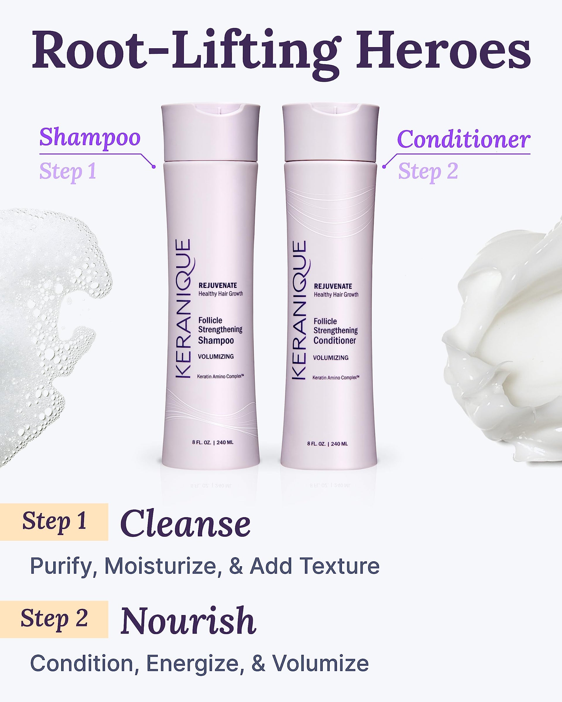 - NO MORE FLAT, LIFELESS HAIR: Pump up the volume, ladies - Keranique anti-aging volume shampoo and conditioner are carefully crafted lightweight formulas that add voluminous texture without heavy residue for a bouncy, natural lift