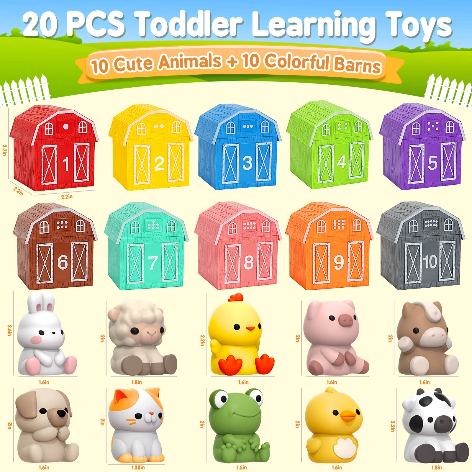 - Montessori Learning Toys: Kids can know and learn about 10 different farm animals and identify their characteristics from our toys.The barn lids are printed with numbers from 1 to 10,and the bodies has dots corresponding to the numbers. Babies can have fun number learning and color matching sorting games based on these,exercise their counting,color recognition,classification and matching skills. Best toddler educational learning toys, let our cute animals accompany your kids through childhood!