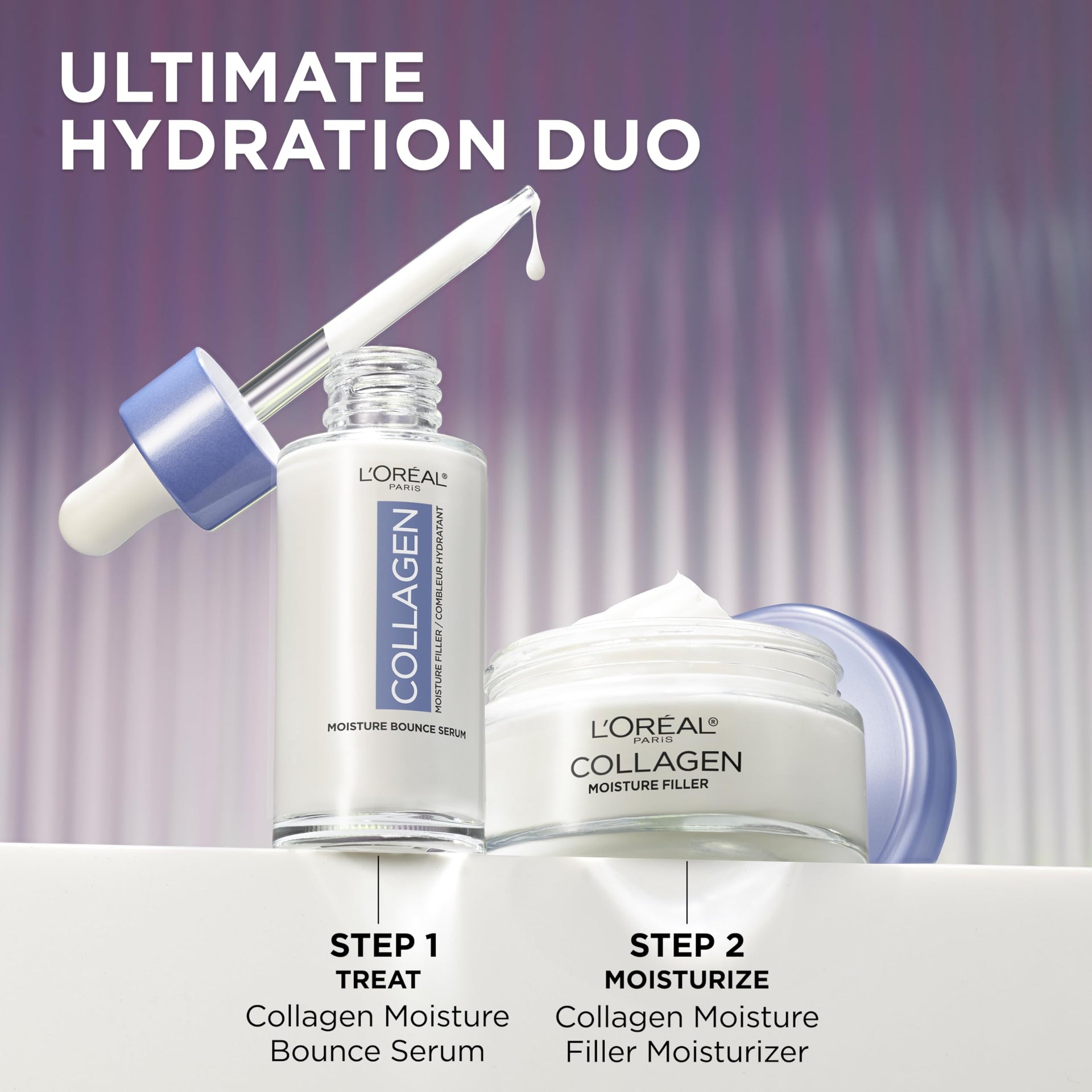 Details: Collagen Moisture Bounce Serum is a lightweight, everyday serum that reveals immediately hydrated and more radiant skin. In 1 week, dry fine lines look minimized. In 4 weeks, skin looks plumper and healthier. This serum is formulated with powerhouse moisturizing ingredients for 72H hydration: Collagen that is extracted & purified to help retain its hydrating qualities, Squalene to help nourish skin with moisture, & Glycerin to lock in skin hydration. Pearlescent, milky texture deeply nourishes skin with an instant glow effect. Derm-tested, dye-free, paraben-free, mineral-oil free, non-greasy and fast-absorbing, this serum is effective for all skin types and suitable for sensitive skin. Use alone or under makeup for a hydrated, healthy glow.