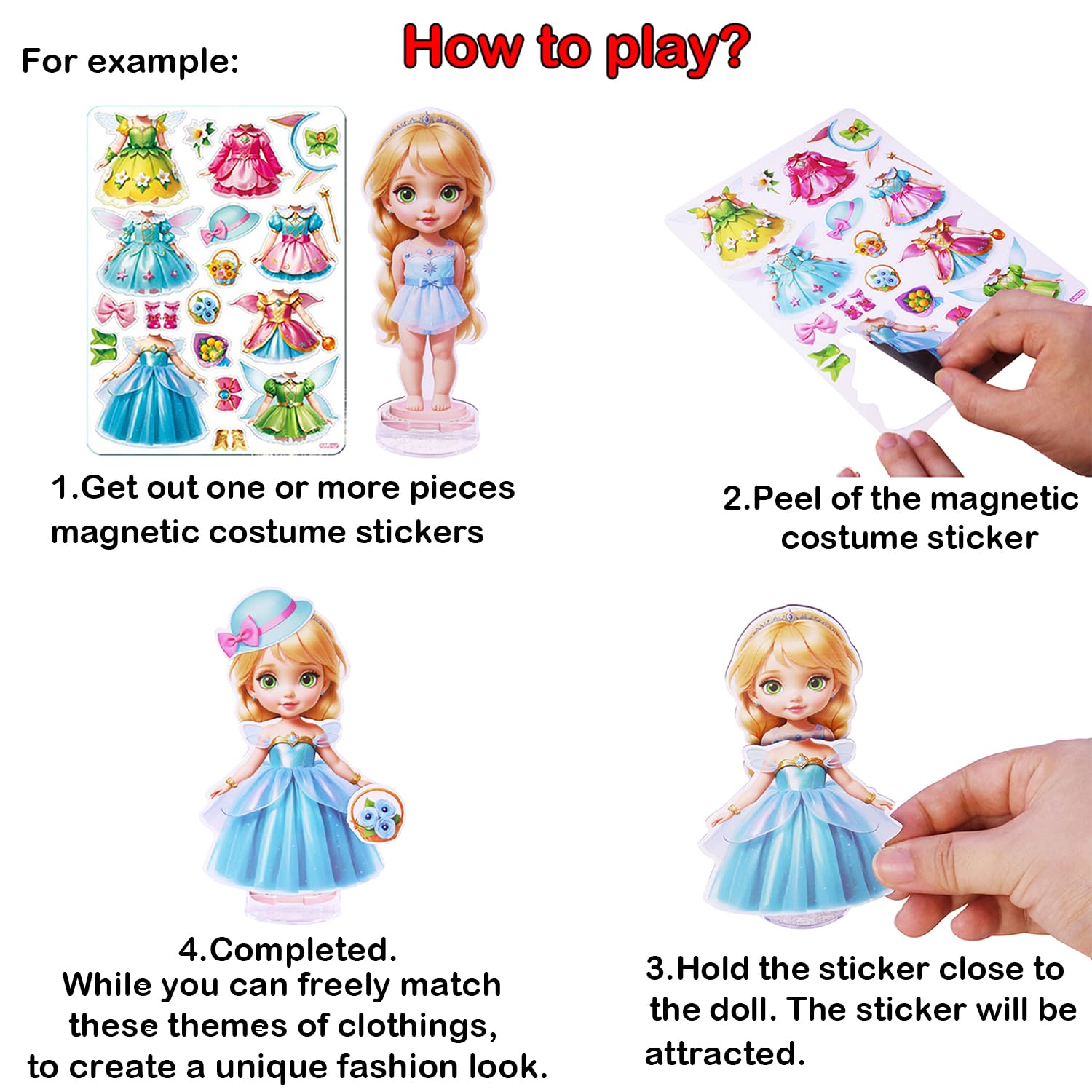 - Our magnetic doll dress up kits included 4 magnetic paper dolls, 4 holders and 4 themes more than 70pcs magnetic clothing and accessories stickers. Each theme contains 6-7 costumes and several accessories.