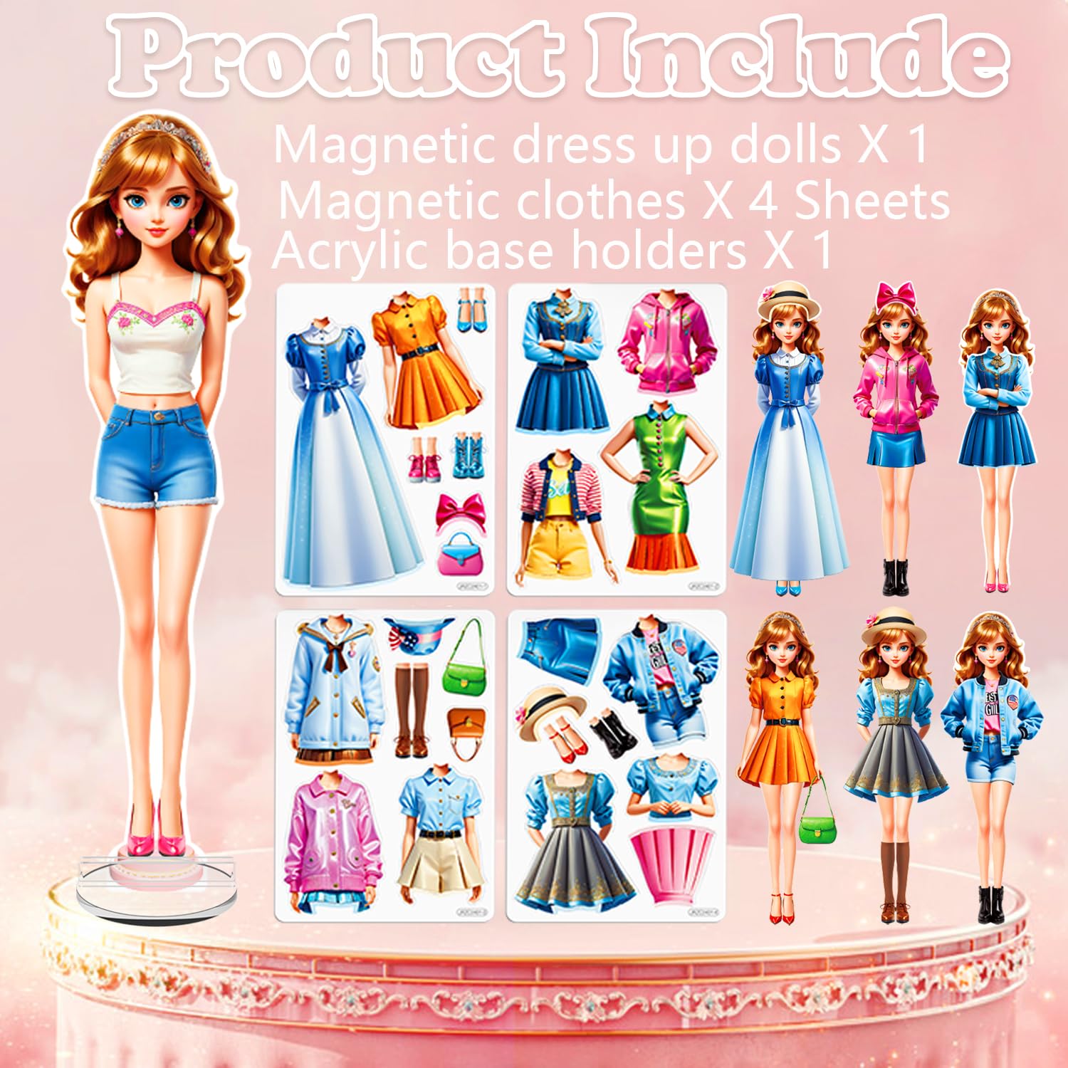 - 【Product Included】Our magnetic doll dress-up kit includes 1*Magnetic paper dolls up to 6 inches tall, 1*Acrylic base holder, 4*Magnetic clothing patches. They can be mixed and matched with each other to create different clothing styles and wonderful fashions. It is a must-have for little girls who like to dress up.