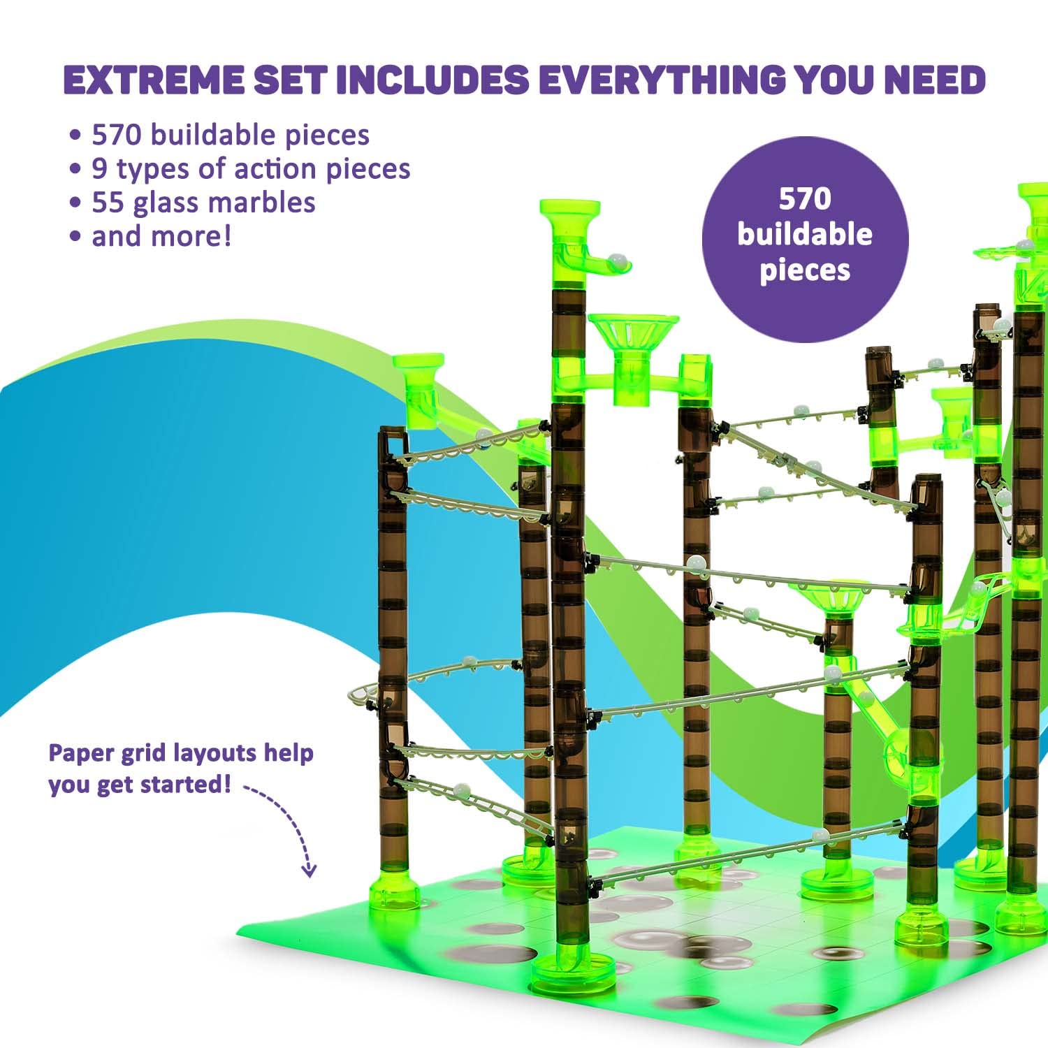 - CREATIVITY: With 625 pieces in total, including over 80 rail building pieces and 20 bases, you'll have everything you need to build massive marble rail runs, race tracks, mazes, and accessories. Let your imagination run wild as you construct intricate designs that challenge the laws of physics and create a mesmerizing spectacle of motion. Perfect for kids and adults alike, this playset provides hours of entertainment and education, promoting problem-solving skills and critical thinking.