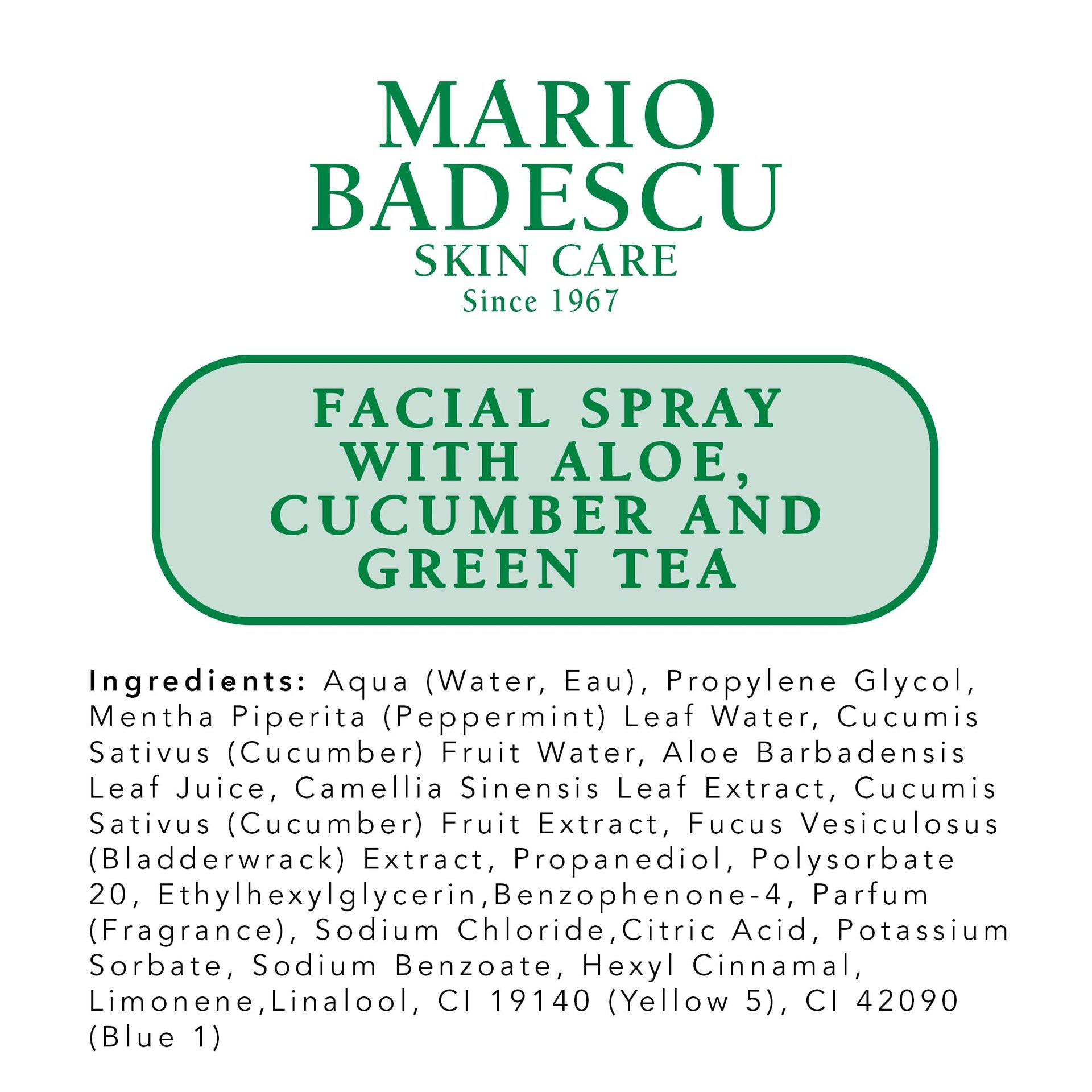 - Try the cooling facial mist spray with multiple benefits: Invigorating. antioxidant-rich Peppermint Essential Water. Hydrating, amino acid-rich Cucumber Essential Water and Cucumber Extract. Mineral-rich, skin-softening Bladderwrack (Seaweed) Extract. Soothing and hydrating Aloe Vera.