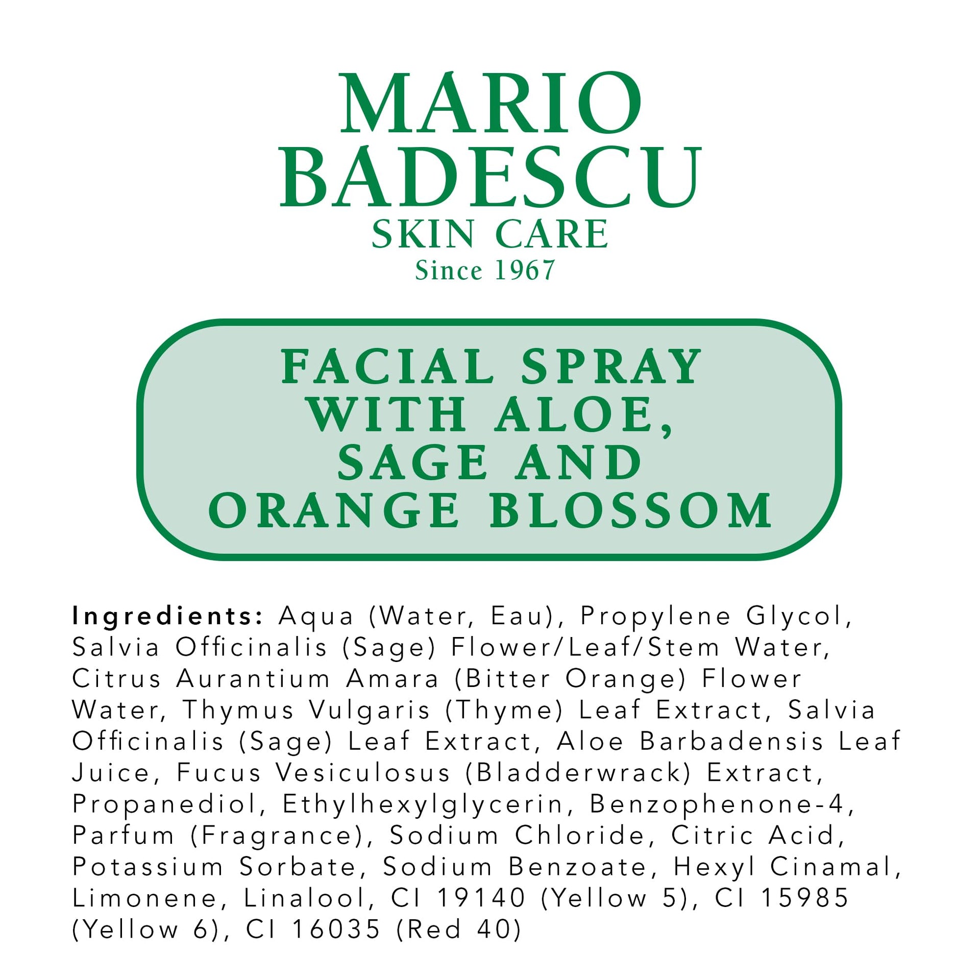 - An uplifting mist of Aloe Vera, Sage, and Orange Blossom Essential Water.