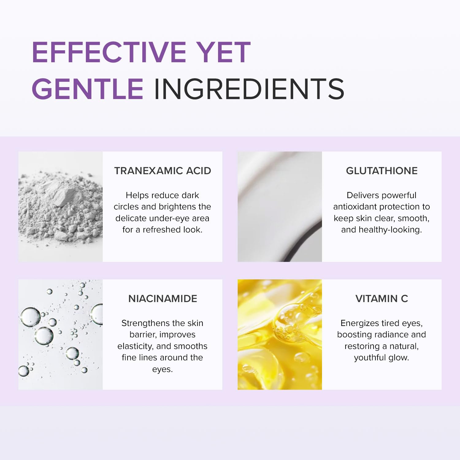 - Powerful Enough for Eyes & Face: Gentle yet potent formula with Tranexamic Acid (TXA), Glutathione, Niacinamide, and Vitamin C to visibly improve skin tone, reduce dark spots, and support collagen for smoother, youthful-looking skin.