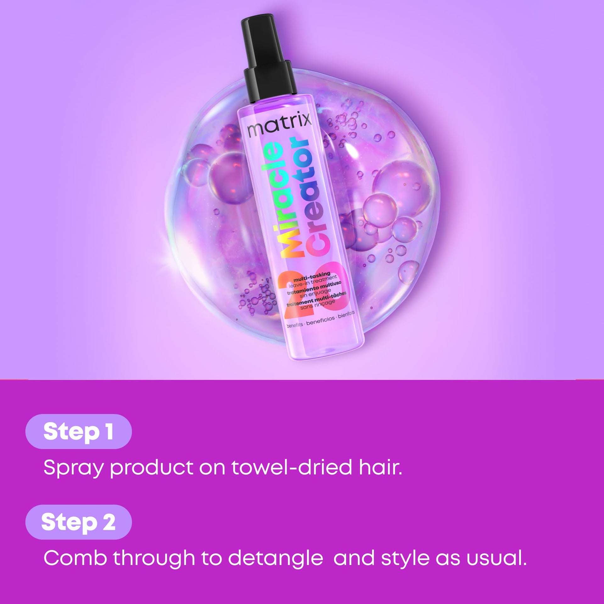Details: "Introducing the Matrix Miracle Creator Leave-In Conditioner Spray, a versatile and sulfate-free hair treatment that addresses multiple hair concerns in one easy-to-use spray. This innovative product is a must-have for anyone dealing with damaged, dry, or unruly hair. Whether you have fine, thick, curly, or straight hair, this leave-in conditioner is designed to work wonders, leaving your locks feeling softer, smoother, and more manageable. One of the key benefits of the Matrix Miracle Creator Leave-In Conditioner Spray is its ability to protect your hair from heat damage. With its advanced heat protectant properties, you can style your hair with confidence, knowing that your strands are shielded from the damaging effects of high temperatures up to 450 degrees Fahrenheit. This ensures that your hair remains healthy and vibrant, no matter how often you use your styling tools. In addition to heat protection, this conditioner spray is a powerhouse when it comes to moisturizing and detangling. The lightweight formula glides through your hair, instantly smoothing out knots and tangles, making it easier to brush or comb. This is particularly beneficial for those with thick or curly hair, which can be prone to tangling and breakage. The spray also helps to lock in moisture, preventing dryness and brittleness, and leaving your hair with a natural, healthy shine. If you have color-treated hair, you'll be pleased to know that this leave-in conditioner is safe to use, helping to preserve your hair color and prevent premature fading. The Matrix Miracle Creator Leave-In Conditioner Spray is also an excellent anti-frizz solution. The conditioner spray is enriched with nourishing ingredients that help to strengthen and repair damaged hair, making it more resilient and less prone to breakage. Regular use can lead to significant improvements in the overall health and appearance of your hair, giving you the confidence to show off your best look.