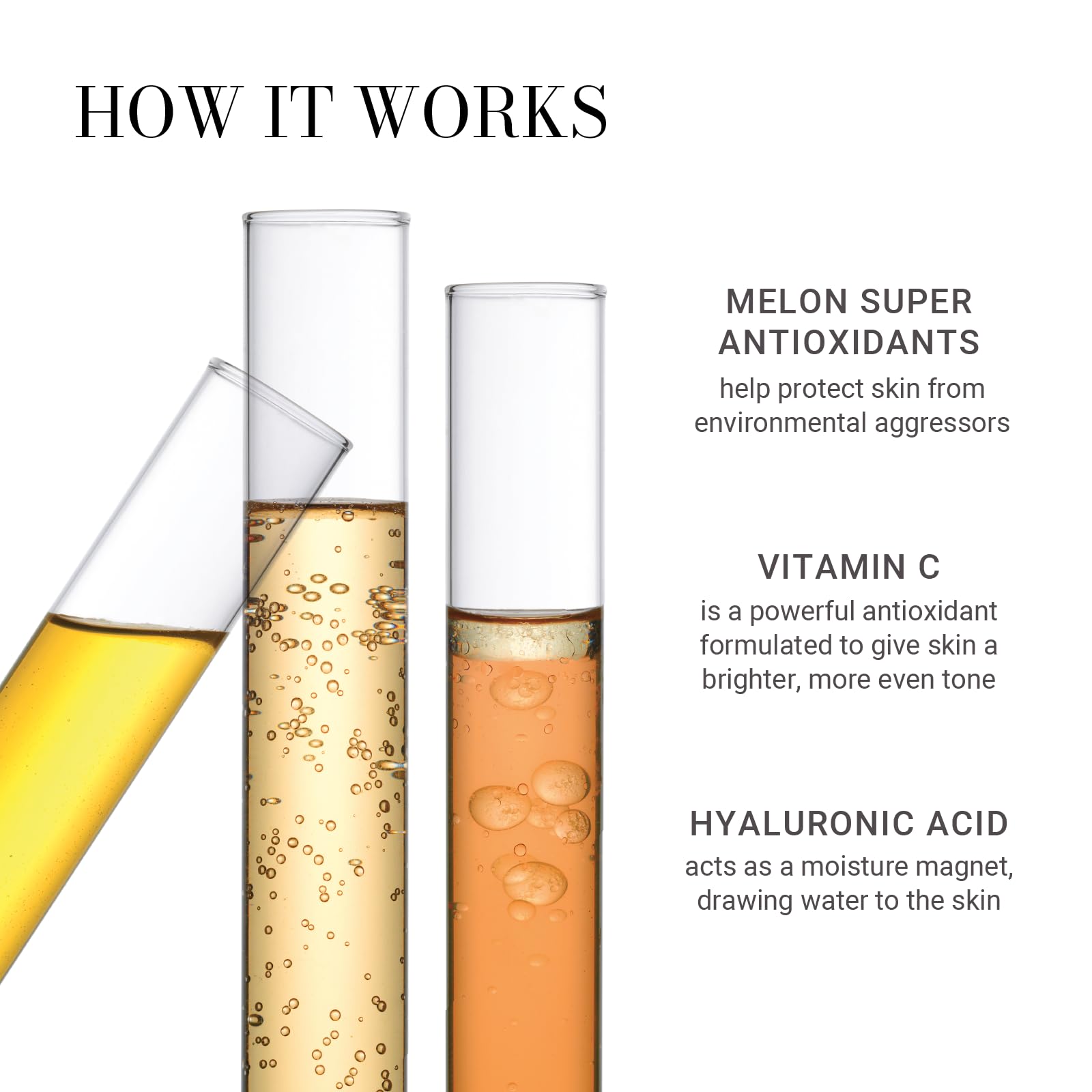 Ingredients:Water (Aqua), Glycerin, Cetearyl Ethylhexanoate, Dicaprylyl Maleate, Polyacrylamide, Dimethicone, Octoxynol-12, Cucumis Melo (Melon) Fruit Extract, Magnesium Ascorbyl Phosphate, Sodium Hyaluronate, Phytic Acid, Dipotassium Glycyrrhizate, Tocopheryl Acetate, Hydrolyzed Casein, Cholesterol, Ceratonia Siliqua (Carob) Gum, Sorbitan Stearate, Hydrogenated Vegetable Oil, Hydrogenated Phosphatidylcholine, C13-14 Isoparaffin, Laureth-7, Xanthan Gum, Magnesium Aluminum Silicate, Polysorbate 20, Polysorbate 60, Alcohol, Benzoic Acid, Chlorphenesin, Methylparaben, Phenoxyethanol, Fragrance (Parfum), Benzyl Benzoate, Benzyl Salicylate, Butylphenyl Methylpropional, Citronellol, Geraniol, Hexyl Cinnamal, Limonene, Linalool.