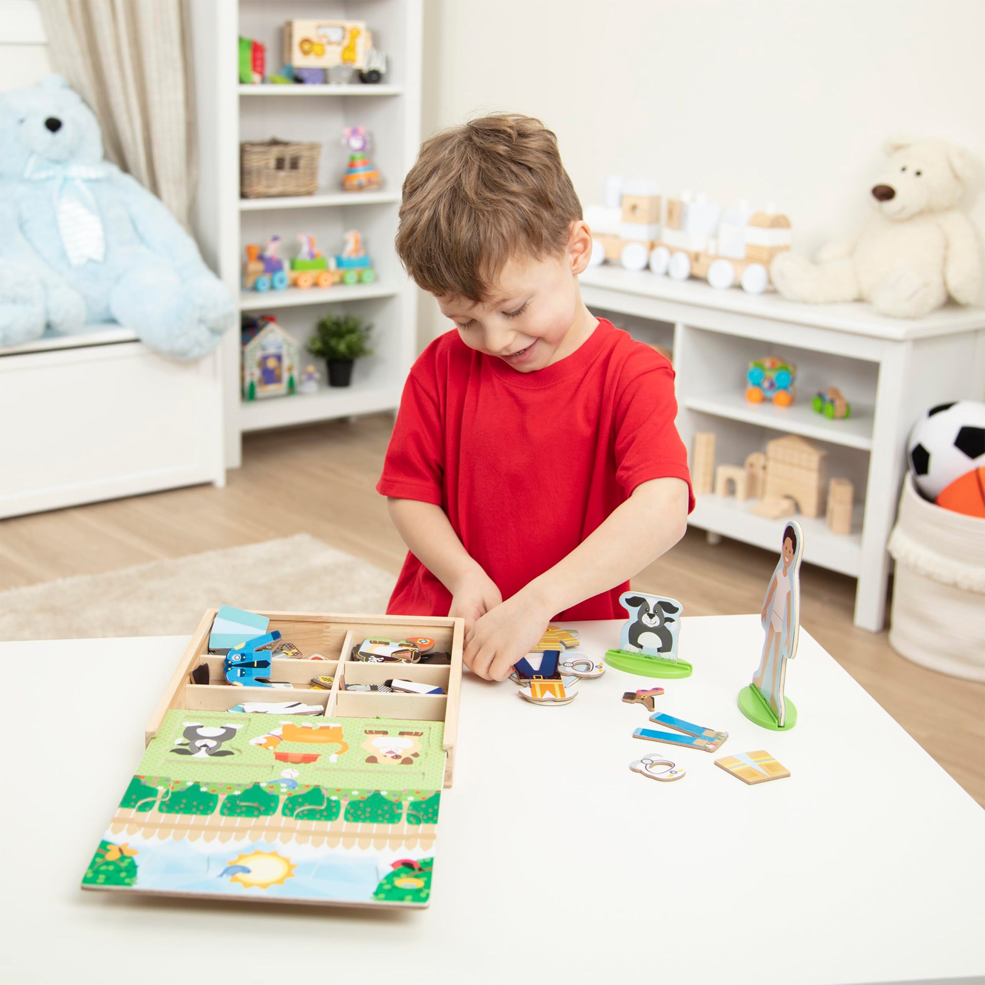 Details: Combine dozens of wooden magnetic pieces in coordinating designs to outfit two double-sided friends and their dogs! Mix and match wooden magnetic clothing and accessories to get the characters ready for work or adventures (doctor, chef, astronaut, construction worker, superhero, pirate, knight, cowboy/cowgirl, firefighter, police officer). The play figures, each with a durable stand for pretend play, and the magnets all store in a sturdy wooden tray with a slide-in lid and convenient carrying handle to take the fun on the go! This unique dress-up dolls set helps kids three and older develop hand-eye coordination and fine motor, counting, and sorting skills, and encourages creative expression and imaginative play. For more than 35 years, Melissa and Doug has crafted wholesome, developmental preschool toys and wooden toys built to last — everything from a life-sized grocery store and play kitchen playset and play food to plush toys and puppets, role play costumes, arts & crafts, and road trip activities for kids. It’s the kind of kid-powered play that nurtures growth, sparks imagination, and builds confidence.