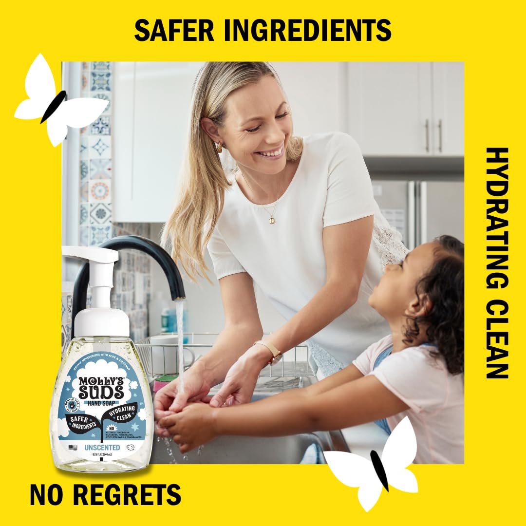 Molly's Suds Foaming Hand Soap, Aloe & Coconut Oil, Moisturizing, Essential Oils, Unscented, Clean Ingredients, 8.25oz Pack of 3