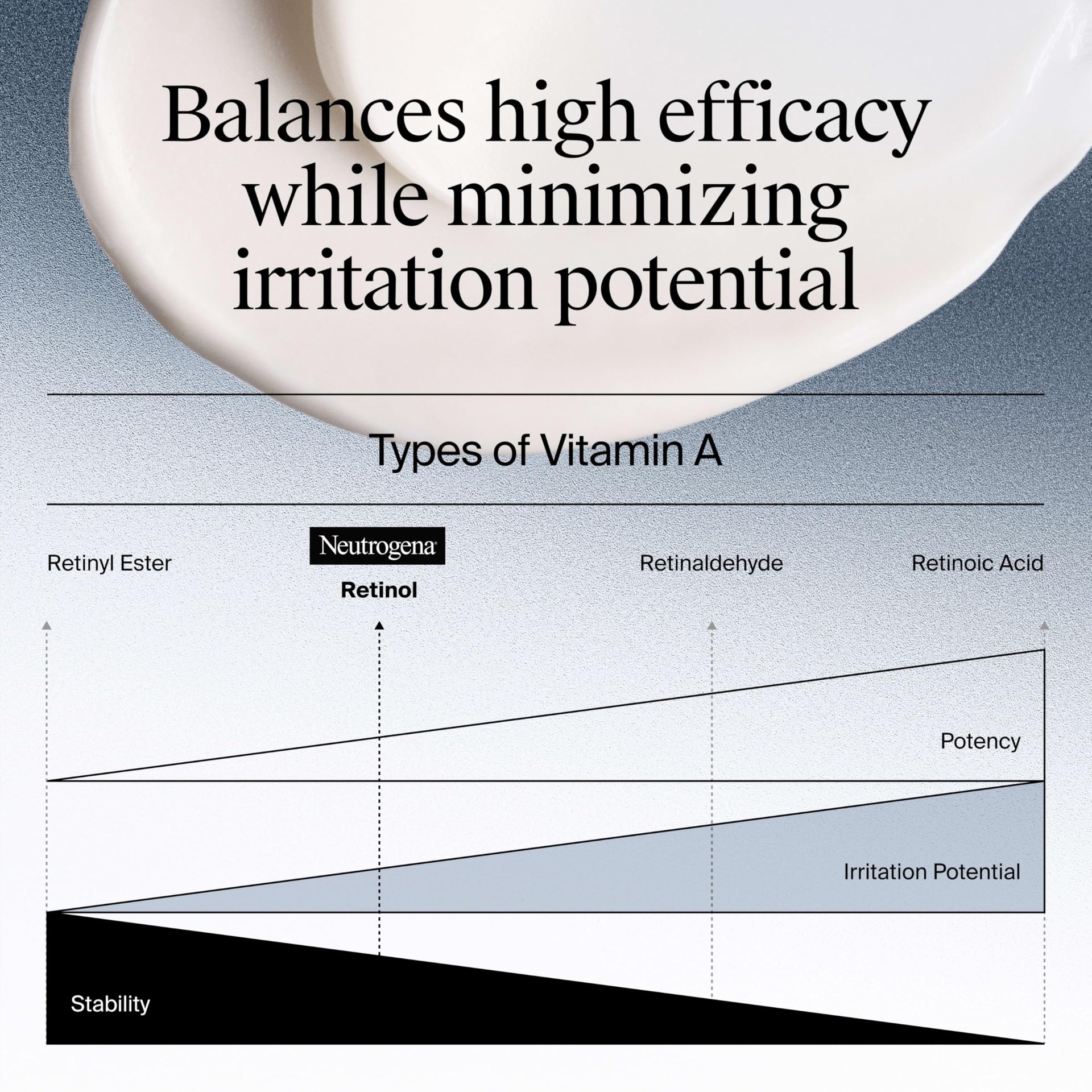 Details: Neutrogena Retinol Regenerating Cream, Fragrance-free, Anti-Wrinkle Face Cream with Hyaluronic Acid helps hydrate your skin while improving the look of fine lines and wrinkles. This facial moisturizer delivers our uniquely stabilized retinol deep within skin's surface to reverse 7 years of visible skin aging with 1 jar based on appearance of under-eye, cheek and crow’s feet wrinkles. The Regenerating Cream delivers up to 2x more retinol bioactivity compared to a leading retinol product**. Retinol cream for face smooths the look of fine lines & reduces the look of dark spots in just 1 week. The anti aging face cream with hyaluronic acid, adds plumping moisture to help hydrate and rejuvenate the look of skin. Suitable for daily use, is formulated without parabens, mineral oil & dyes and comes from a dermatologist recommended brand. (**based on Nielsen sales data for US retinol anti-aging category for 52 weeks ending 30-Nov-2024)