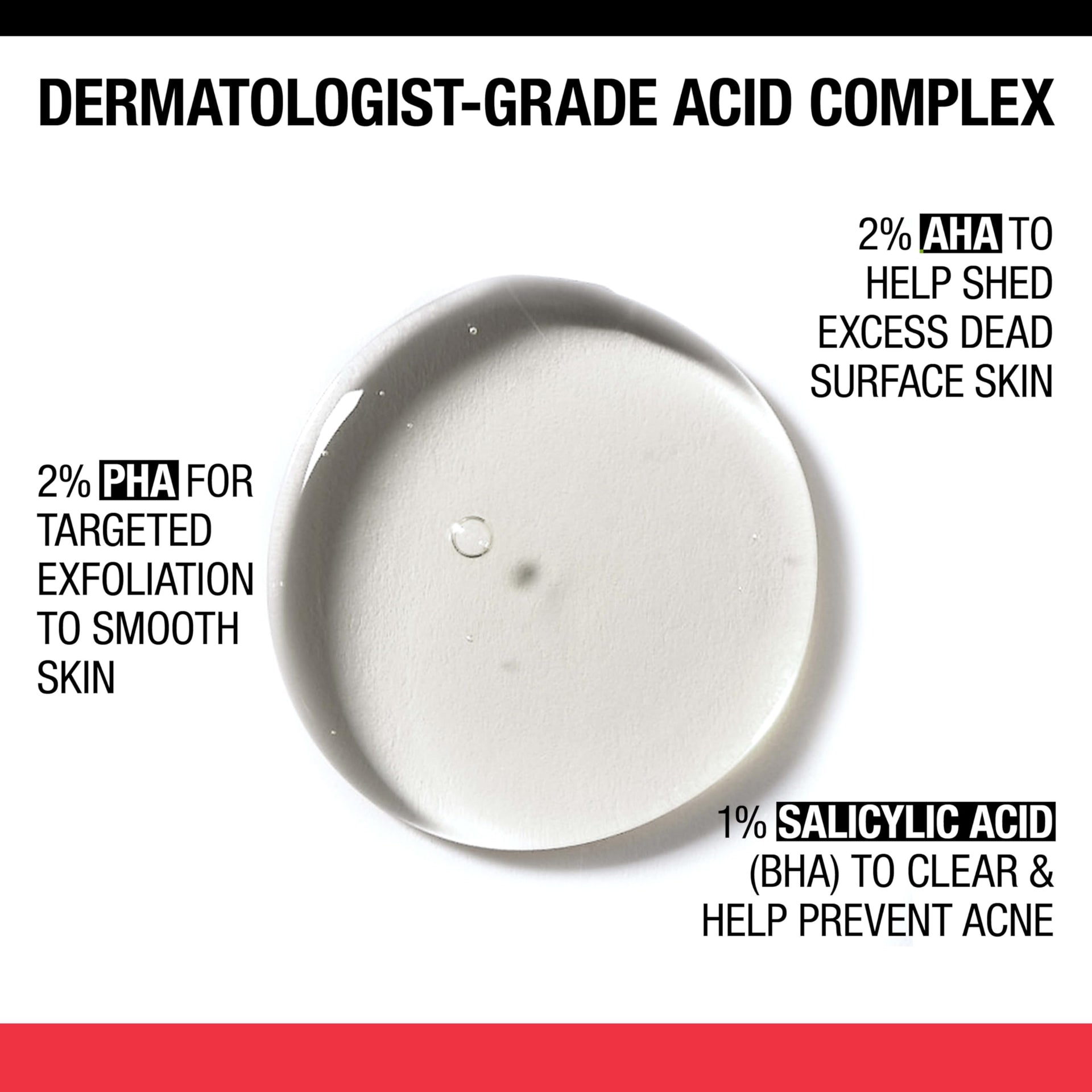 - The dermatologist grade acid complex contains 2% glycolic acid (AHA) to help loosen and shed excess dead surface skin plus 2% polyhydroxy acid (PHA) for targeted exfoliation to clear and smooth skin