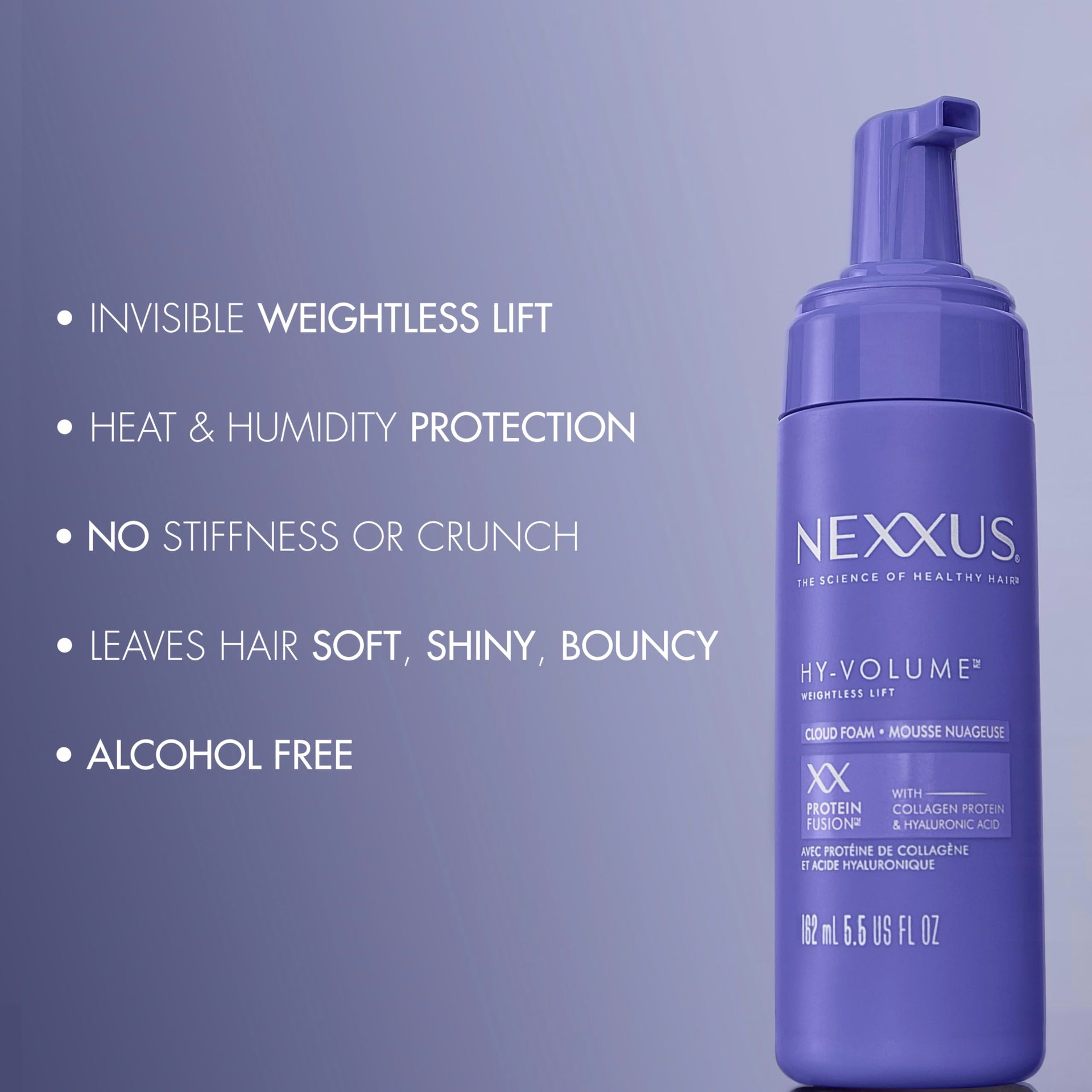Details: It's time for a volume revolution with New Nexxus HY-VOLUME Weightless Lift Collection, get 3x weightless, healthy volume in 1 use. The collection has a revitalizing aroma of citrus breeze fragrance with uplifting white citrus notes balanced with delicate floral tones for long-lasting freshness. Our Cloud Foam is the first tubing technology with hyaluronic acid, to instantly strengthen, plump and lift every hair strand from root to tip for 48h of gravity defying volume. Our formula contains exclusive protein fusion blend with collagen protein and hyaluronic acid. Our first ever foam not only enhances your hair's appearance but also defends against humidity, heat, and sweat. The alcohol free product is a combination of plumping serum + sculpting mousse infused with air microbubbles for a weightless finish. This airy, heat-protecting foam offers 3x the volume and lift compared to untreated hair, without any stiffness or crunch. Your hair will feel weightlessly soft, shiny, and have a healthy bounce that is life and sleep proof, even on day 2. For best results, start with Nexxus HY-VOLUME Shampoo and Conditioner. Follow with HY-VOLUME Cloud Foam. To use, section damp hair and apply 2-3 pumps at the roots, working through to ends. Blow dry with a round brush for maximum lift. Born in salons and perfected by science, our Nexxus collections were crafted by our team of expert scientists and stylists. We care about your hair health from shower to style. All of the shampoos and conditioners have our exclusive h4 complex to restore and protect the 4 signs of hair health: strength, moisture, elasticity, and shine. Our styling collection has exclusive StyleProtect Technology to protect hair from damage as you style. By choosing Nexxus, you know you are doing something for your hair, not to your hair, ensuring you look your best.