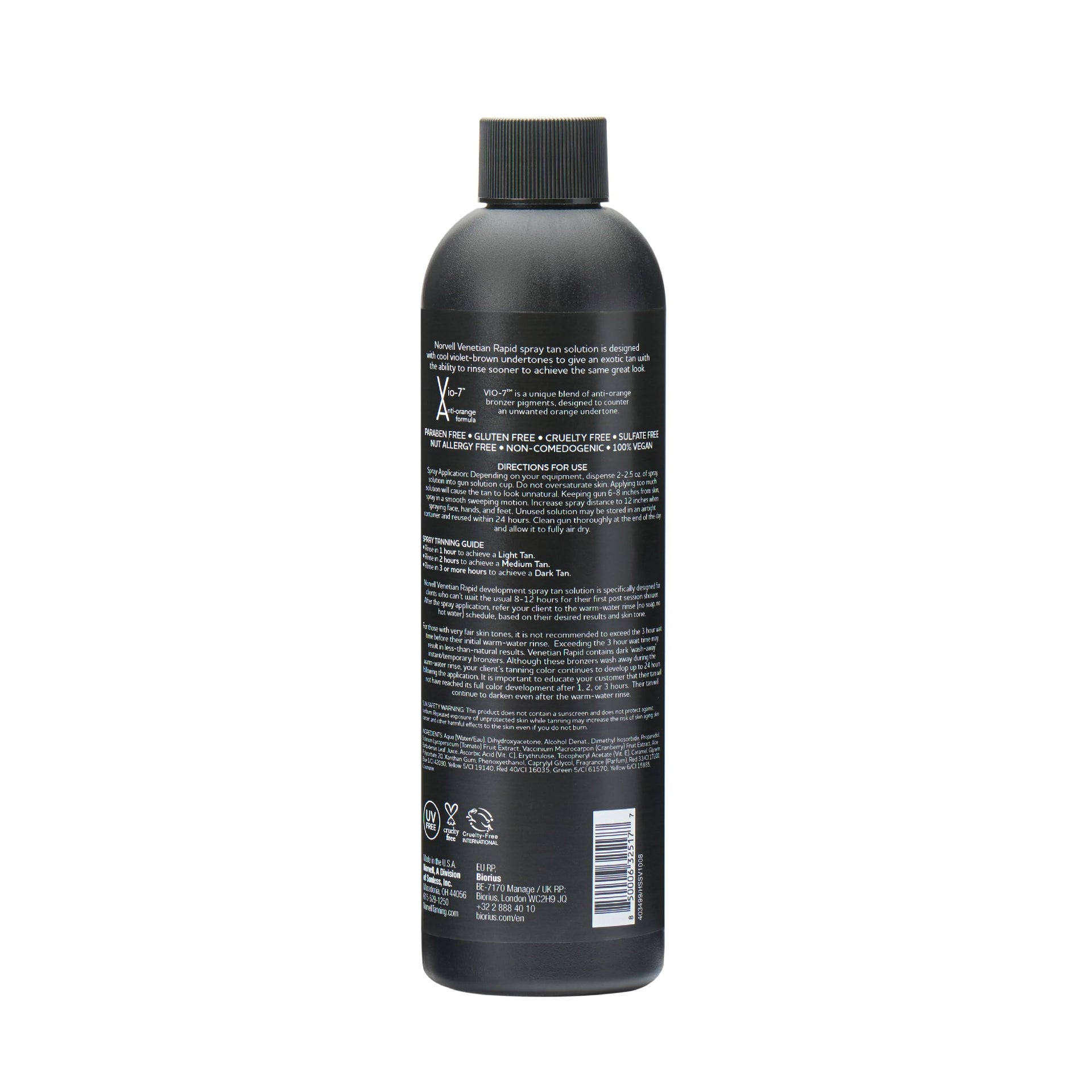 - VENETIAN ONE SUNLESS SOLUTION: An exotic sunless formula with a unique combination of violet and brown tone bronzers, designed to mimic skin colors found on the beautiful beaches of the European Riviera. Deliberate and innovative formulation blends with all skin tones to produce a deep, long lasting tan. For those who want VENETIAN Sunless Solution, but dont have a lot of time to spare, the VENETIAN ONE formulation provides swift sunless color while allowing for sooner rinse times.