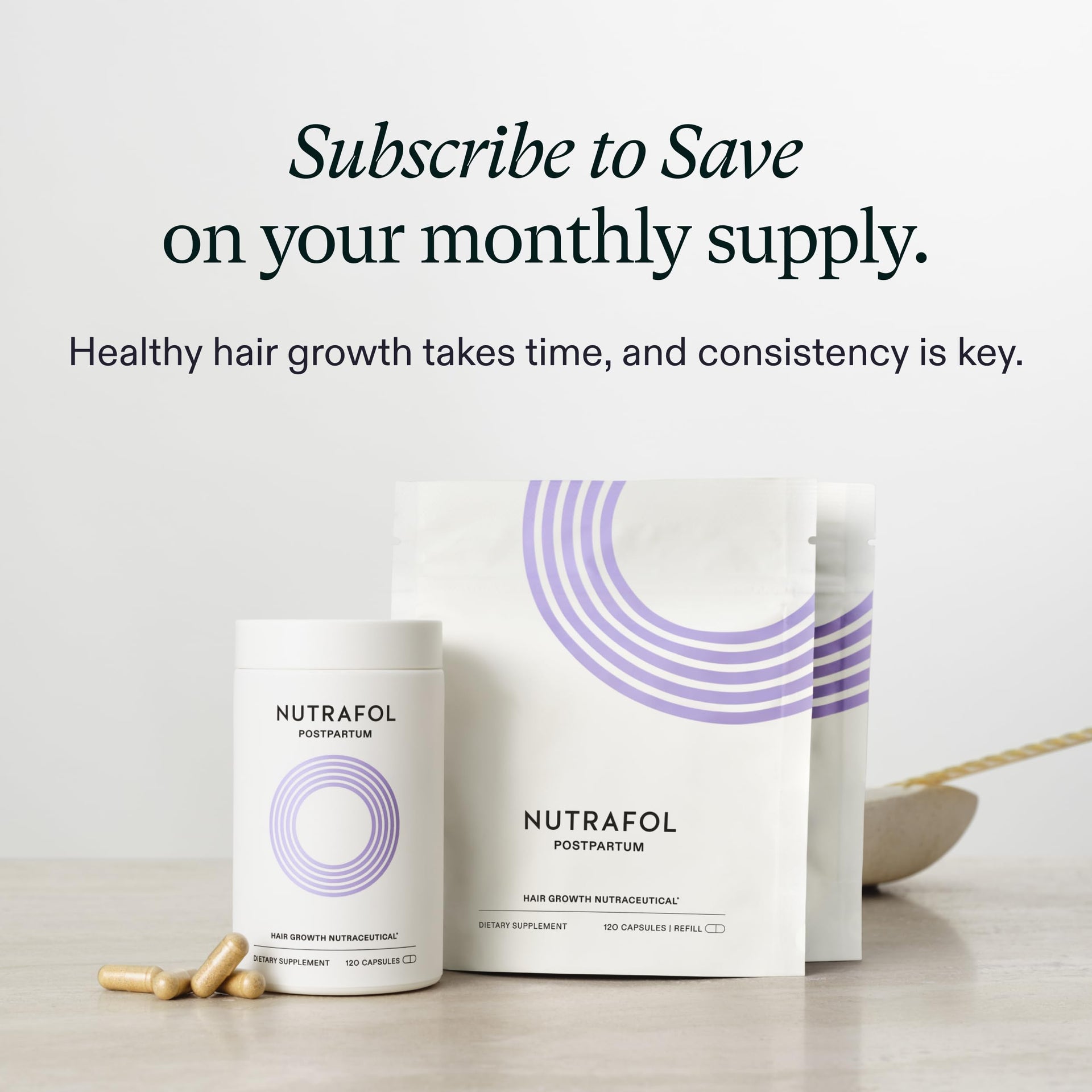 - 1-MONTH SUPPLY: One (1) bottle of Nutrafol Postpartum Hair Growth Supplements that support visibly thicker, stronger hair and less shedding (10)