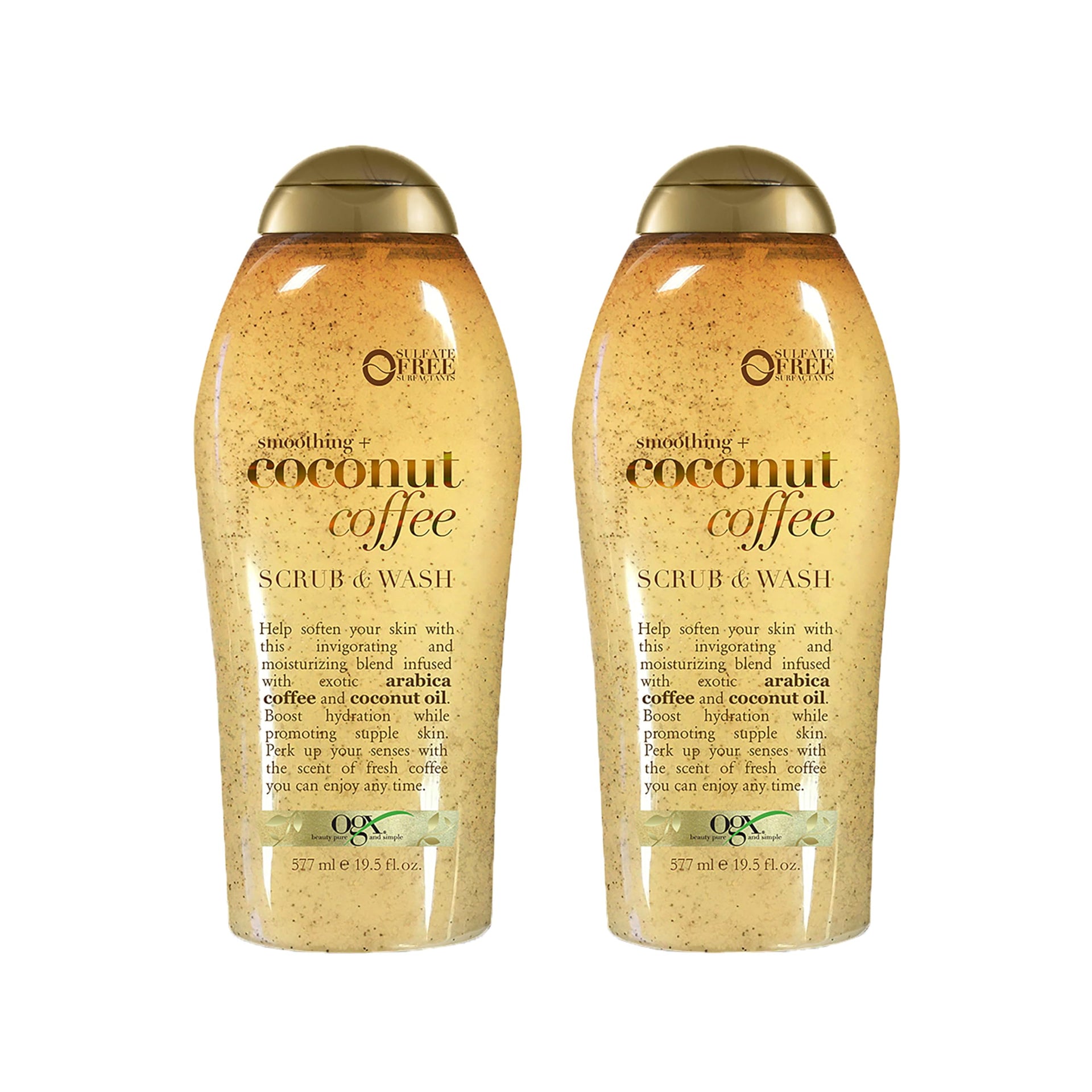 - EXFOLIATING BODY SCRUB: 19.5-fluid ounce bottles of OGX Smoothing plus Coconut Coffee Exfoliating Body Scrub and Wash is blended with exotic arabica coffee and coconut oil to help soften and hydrate your skin
