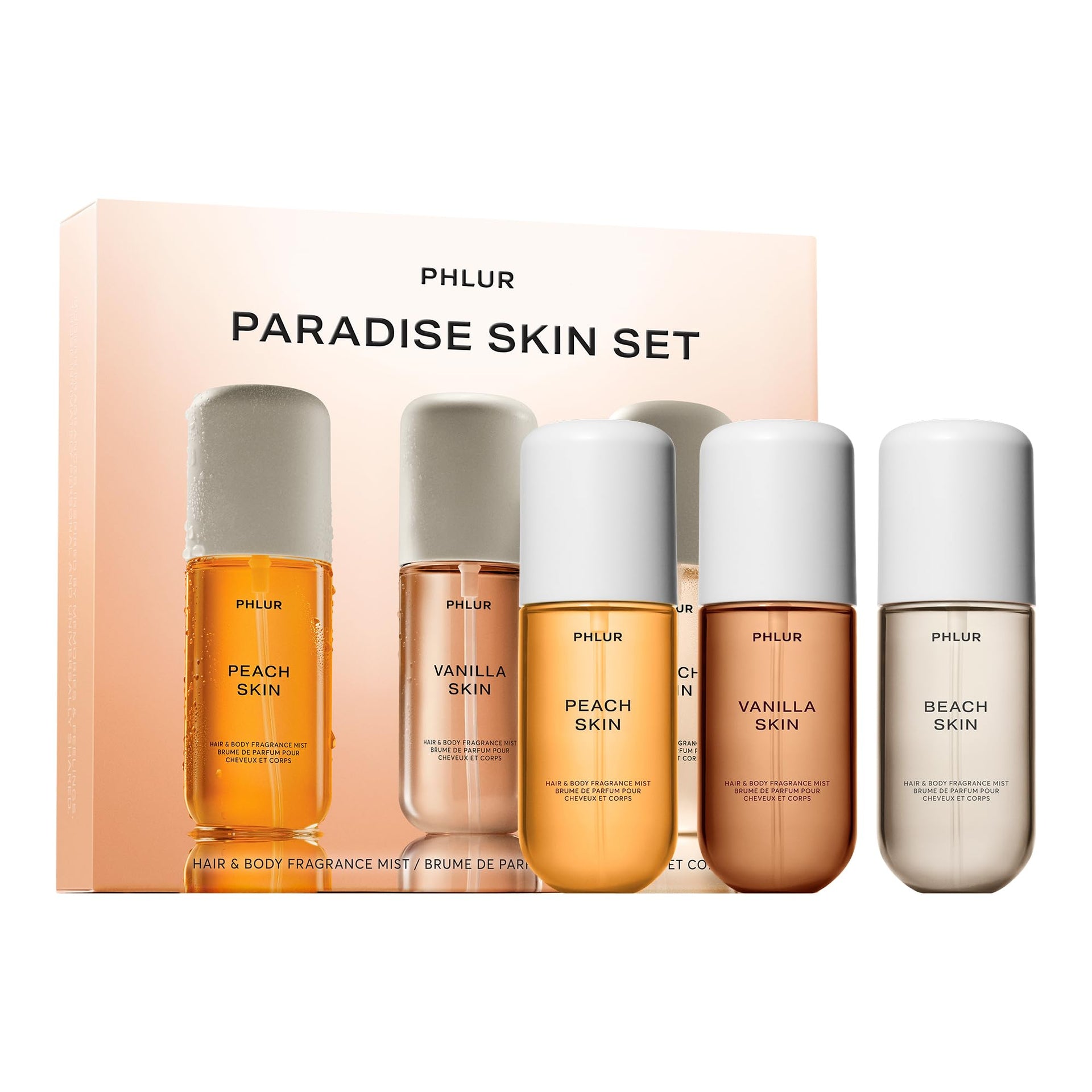 - PARADISE, BOTTLED: Peach Skin’s lush, velvety fruit mingles with the soft, sun-warmed whispers of Beach Skin, while Vanilla Skin drapes every note in comforting sweetness. Together, they create a trio that transports you to a tropical escape.