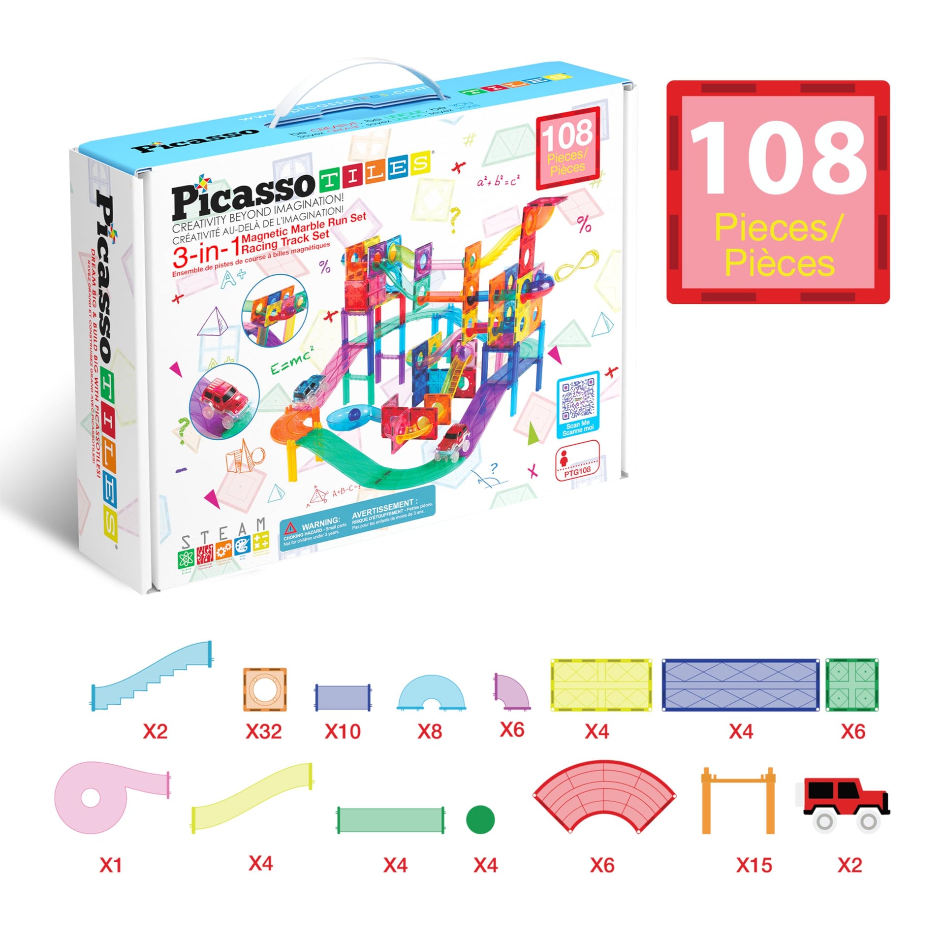 PicassoTiles 108pc 3-in-1 Marble Run & Car Track Magnetic Building Blocks STEM Toy Set for Kids, Brain Development & Educational Play