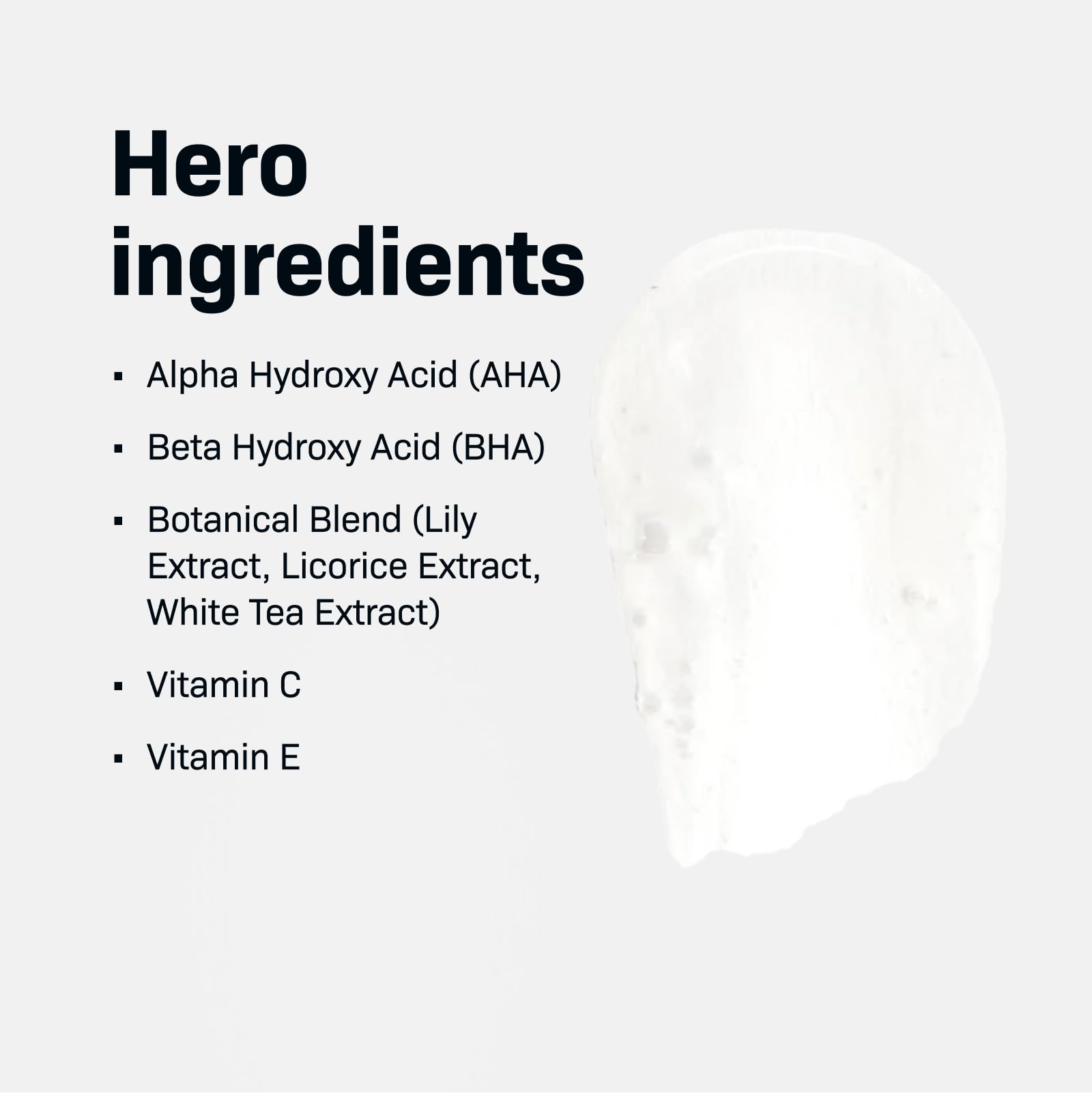 - Ingredients: Water (Aqua), Cocamidopropyl Betaine, Sodium C14-16 Olefin Sulfonate, Decyl Glucoside, Acrylates Copolymer, Glycereth-2 Cocoate, Sucrose Laurate, Glycolic Acid, Glycol Distearate, Arctostaphylos Uva Ursi Leaf Extract, Lilium Candidum (Lily) Flower Extract, Camellia Sinensis Leaf Powder, Magnesium Ascorbyl Phosphate, Salicylic Acid, Glycerin, Glycyrrhiza Glabra (Licorice) Root Extract, Tocopherol, Aminomethyl Propanol, Butylene Glycol, Steareth-4, Citric Acid, Benzoic Acid, Fragrance (Parfum).