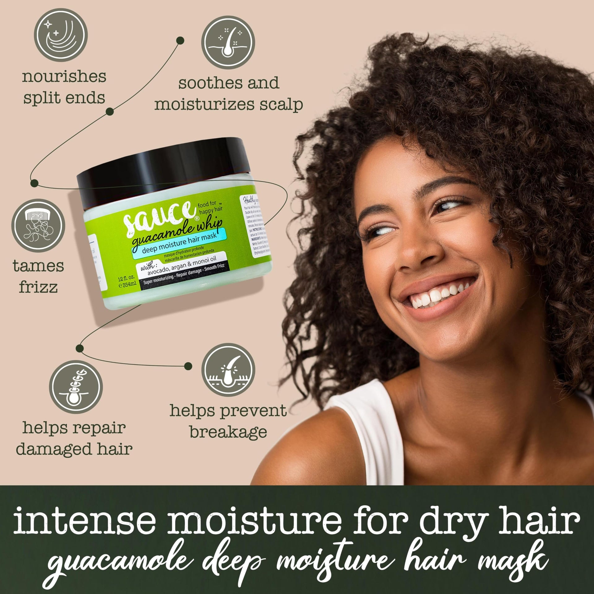 - Sauce Beauty Guacamole Hair Mask: At Sauce Beauty, we're inspired by how real ingredients can nourish not just your body, but also your hair; Our iconic avocado hair mask includes ingredients like argan oil & honey to focus on hair repair & treatment
