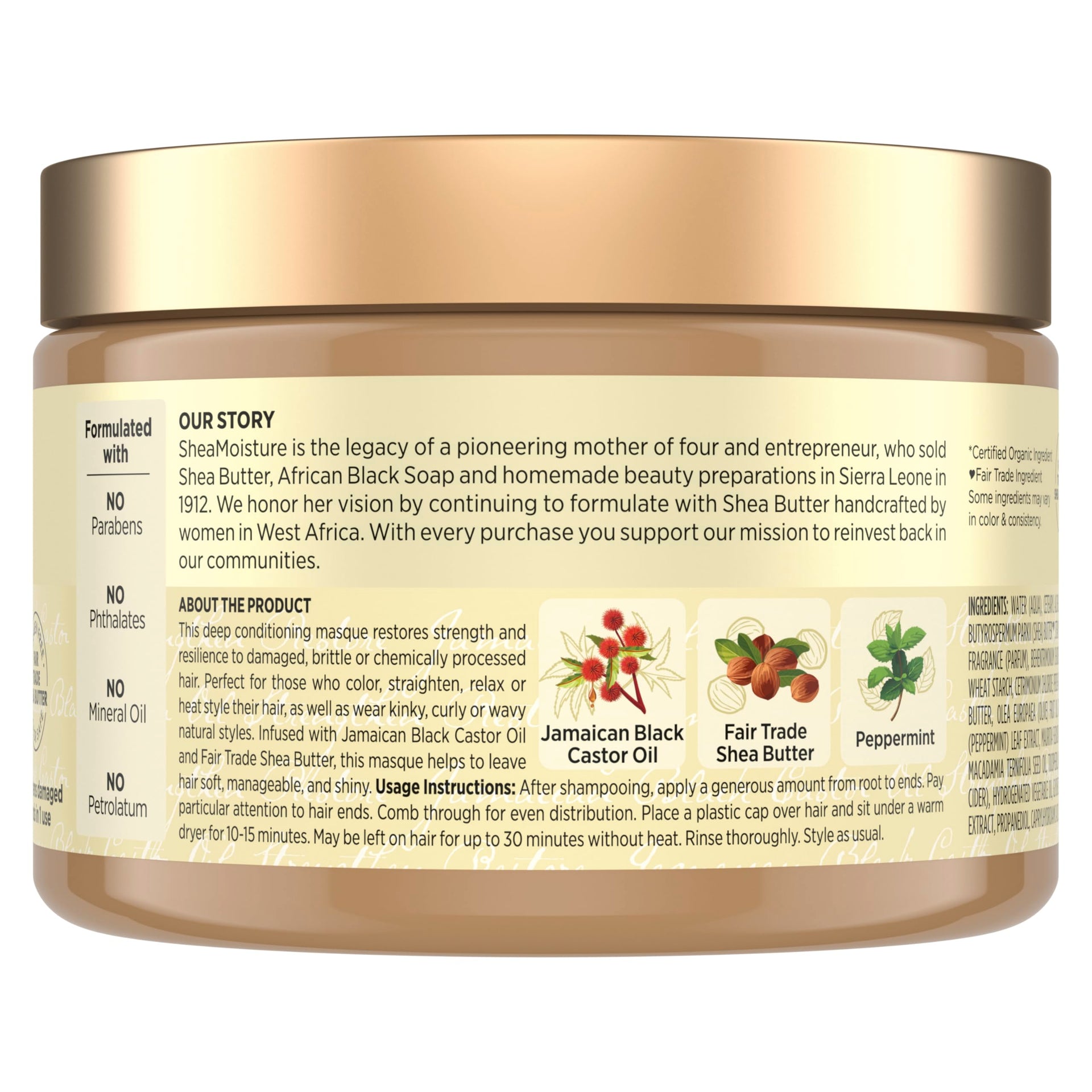 Details: SheaMoisture Jamaican Black Castor Oil Strengthen and Restore Masque is a deep conditioning and hydrating hair mask that helps to strengthen and restore damaged or chemically processed hair. This hair mask and deep conditioner replenishes moisture and softens hair by supporting elasticity, reducing the appearance of breakage and shedding; it's our best hair mask for curls. Our deep conditioning hair mask is perfect for those who regularly color, straighten, perm or heat style their natural hair. Formulated with Jamaican Black Castor Oil and Shea Butter, this deep conditioner hair masque strengthens damaged hair and chemically processed hair. All SheaMoisture hair products are sustainably produced and cruelty-free. This SheaMoisture hair mask is formulated with no silicones, no sulfates, no parabens, no phthalates, or petrolatum. These hair products, including this hair masque by SheaMoisture, have been tested on family and friends for generations and never on animals. Our Story: SheaMoisture is the legacy of Sofi Tucker, a pioneering mother of four and entrepreneur who sold Shea Butter, African Black Soap and homemade beauty preparations in Sierra Leone in 1912. We honor her vision by continuing to formulate with Raw Shea Butter handcrafted by women in Africa. With every purchase you show support of our mission to reinvest back in our communities.