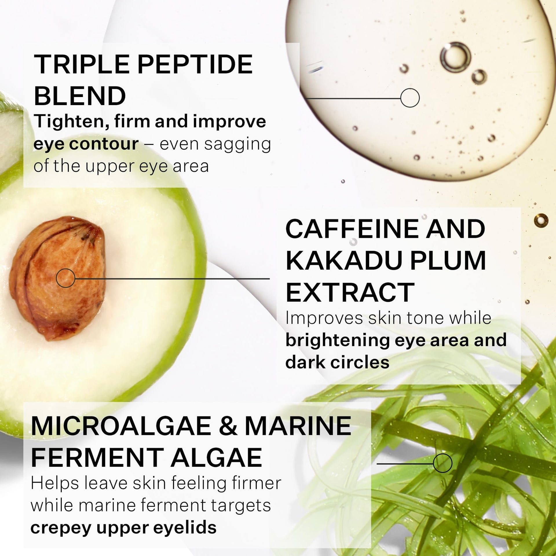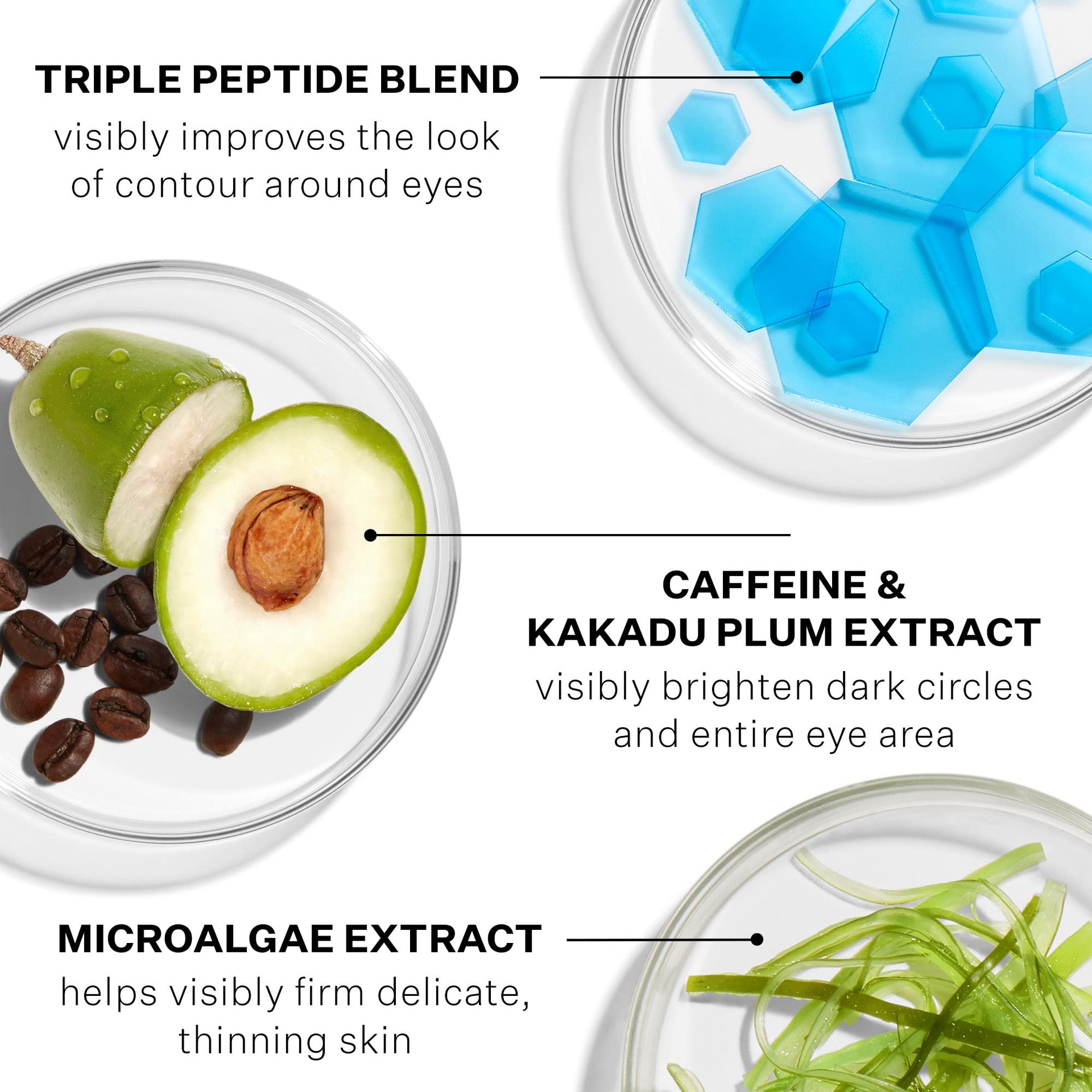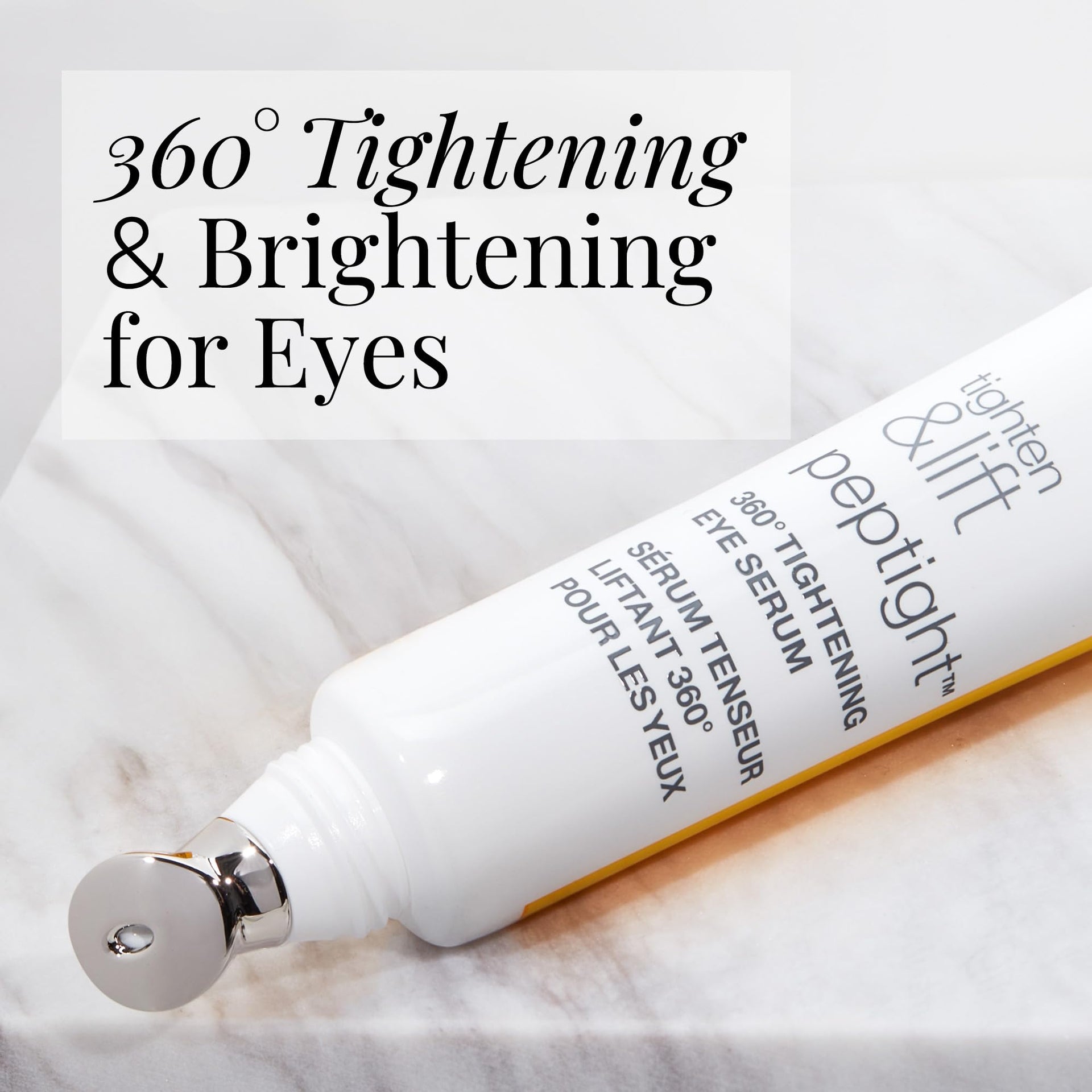 See dramatic eye results all around with our best selling eye serum, now upgraded to harness the power of three unique peptides to visibly tighten, firm, and brighten the entire eye area. This light, layerable formula absorbs in the blink of an eye with a non-tacky feel for dimensional results along the upper and under eye, plus crow's feet and eyelids. Bolstered by a cooling applicator that gently massages and depuffs to reinvigorate this delicate skin.