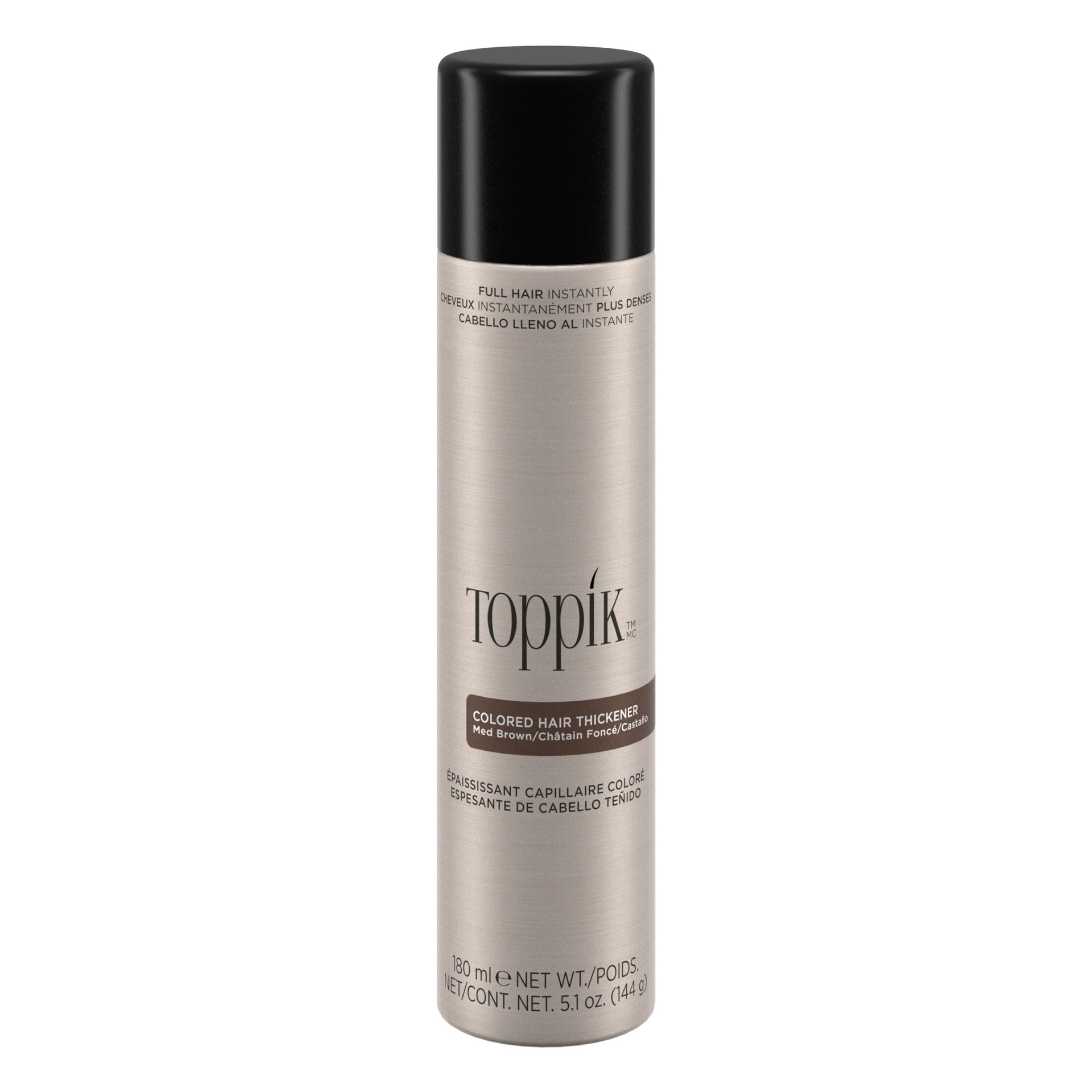 Details: Toppik Colored Hair Thickener is an innovative color spray solution designed to disguise areas of thin or thinning hair, scalp show-through, bald spots and root re-growth between color appointments.This lightweight, long-lasting hair thickener is gentle on the scalp, safe for everyday use and available in 5 shades that resist wind, rain, and perspiration. Use with Toppik Hair Fibers for additional coverage and natural texture. Easily shampoos out. Won't clog pores. Available in a 5.1 oz/144g bottle.