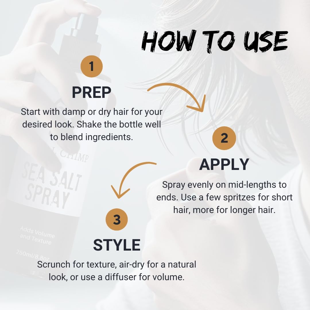 - Beachy Waves with Sea Salt Spray: Get that just-off-the-beach look with our sea salt spray, designed to enhance natural waves and add volume without the sticky feel. This hair texture spray creates a lightweight, matte finish while keeping hair manageable. Whether you're after a relaxed, tousled style or a structured, textured look, this texturizing spray delivers the perfect balance of hold and flexibility.