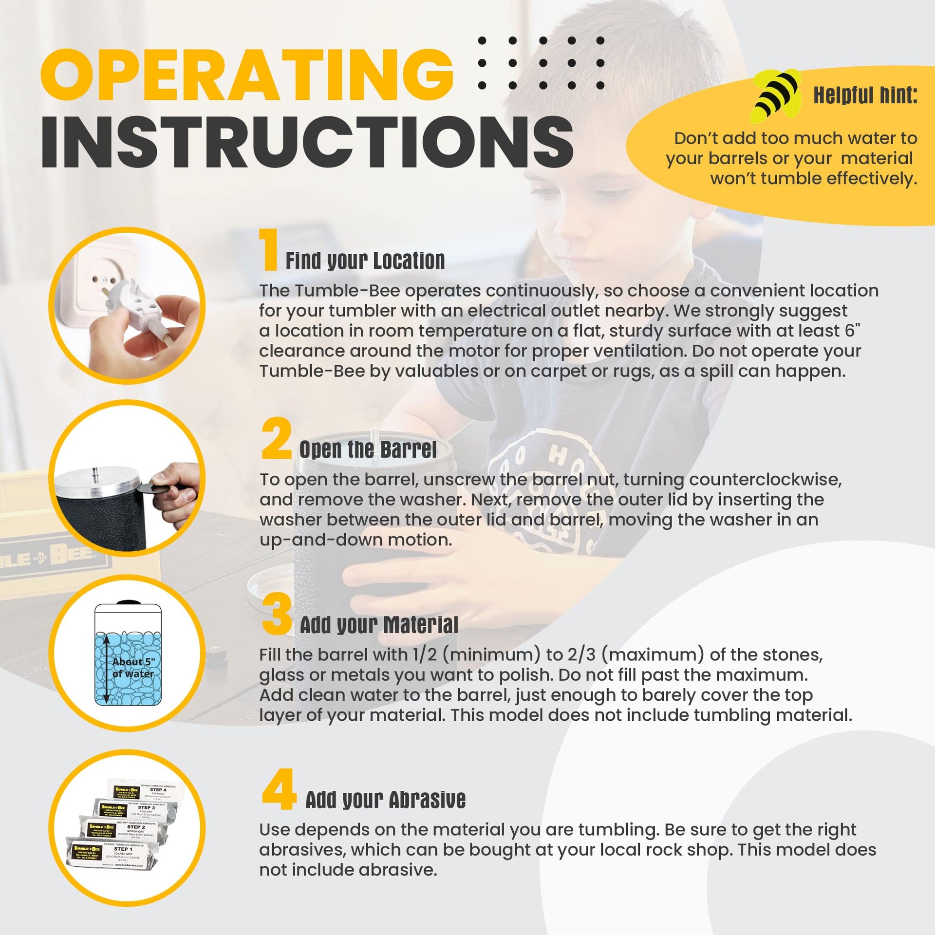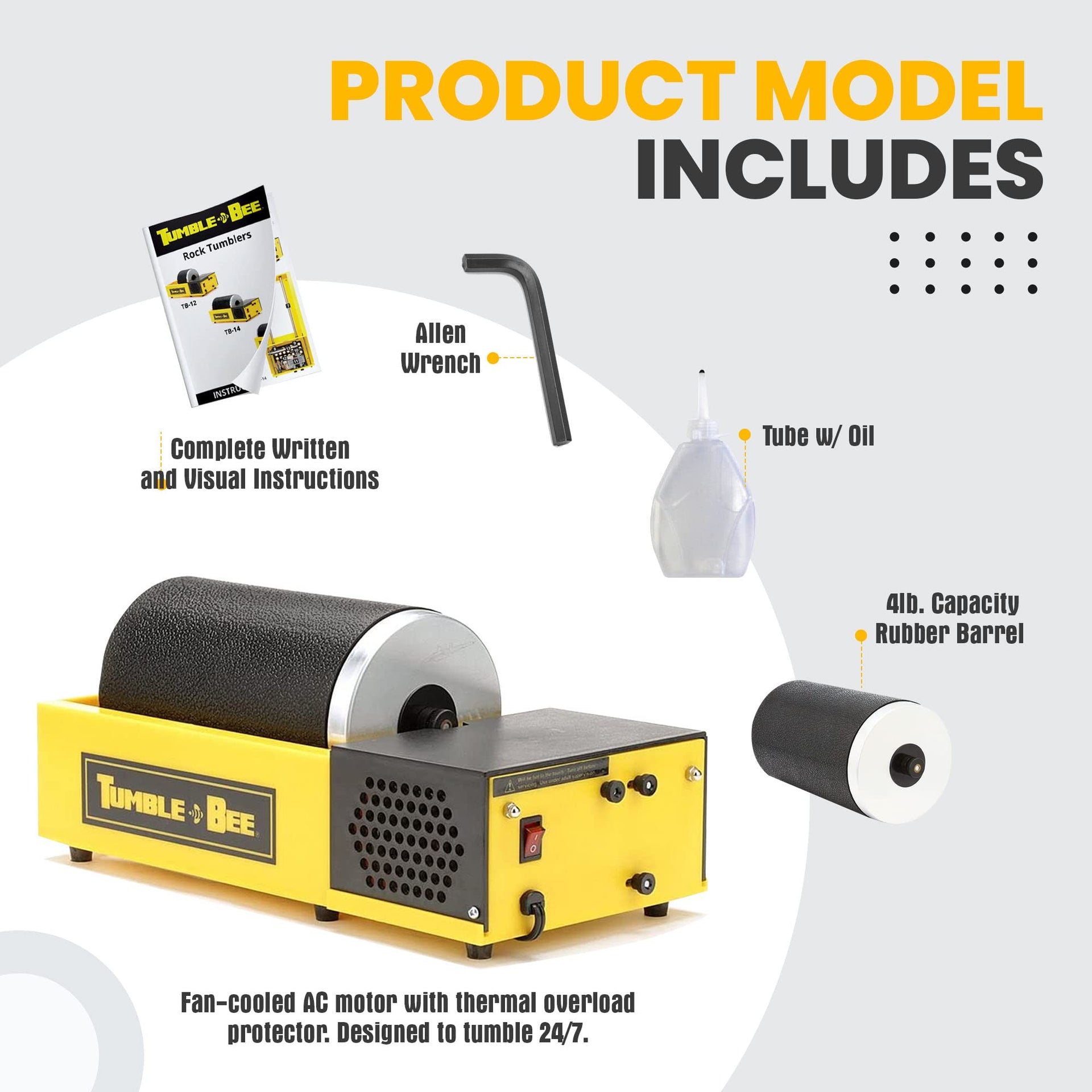 - BUNDLE INCLUDES: Our rock tumbling kit includes everything you need to complete your collection, including one 4lb rubber rock tumbler barrel, one bottle of clean, lightweight oil, one 3/64" Allen wrench, and a detailed instruction manual. This easy-to-use Tumble-Bee rotary rock tumblers is a great rock tumblers and polishers for professionals and beginners!