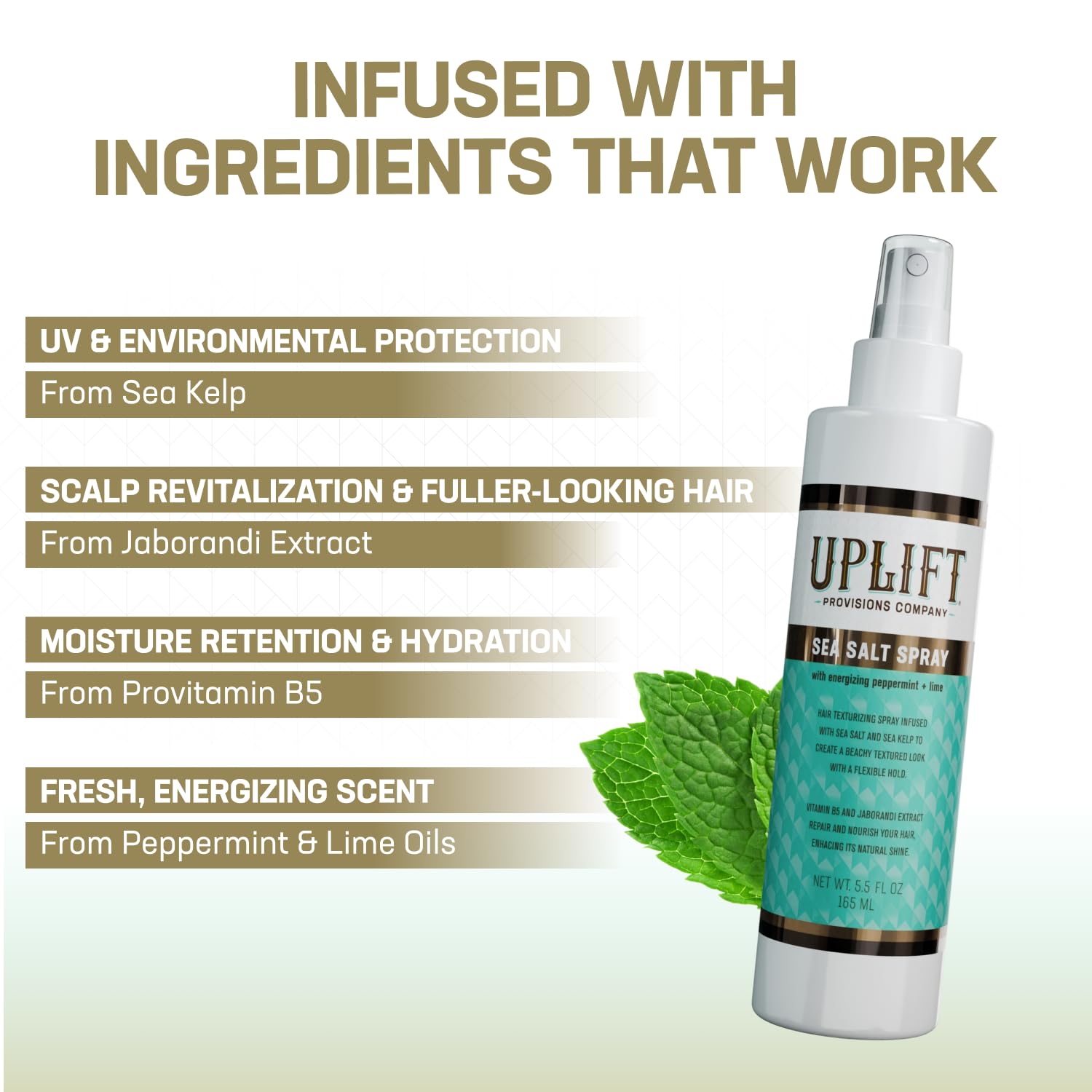 - Chase the Waves, Not the Frizz - Fortified with the nourishing power of sea kelp, rejuvenating jaborandi, moisture-sealing jojoba, and strengthening Vitamin B5, Uplift's sea salt texturizing mist conditions hair, defends against UV damage, and battles frizz. Delight in a product that styles, nourishes, and protects—granting you that fresh-off-the-beach confidence.
