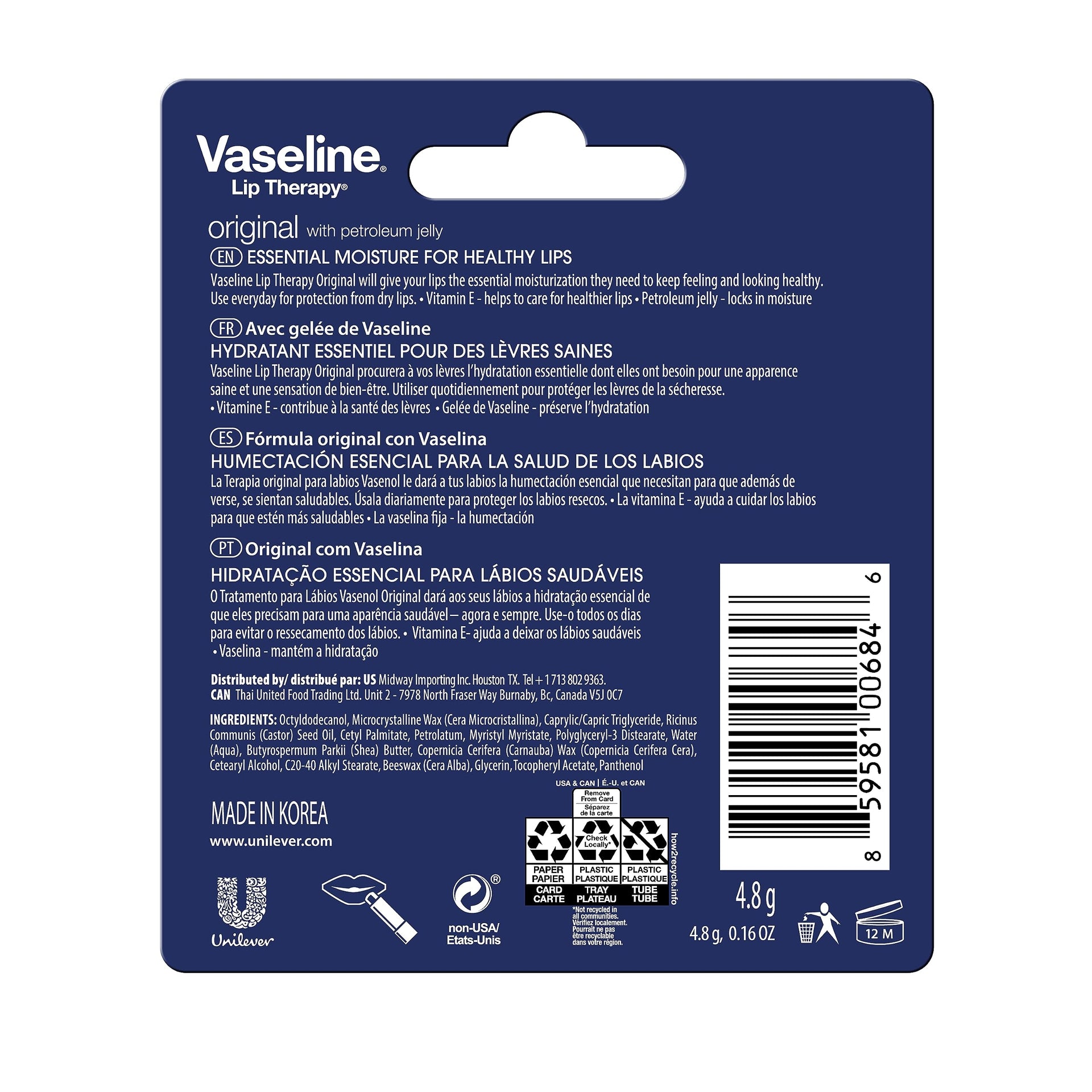 Details: Give your lips the essential moisturization they need with Vaseline Lip Therapy sticks. With the soothing power of petroleum jelly, Vaseline Lip Therapy sticks soothes and softens your lips while providing essential hydration for long lasting smoothness. Available in four variants: Aloe Vera, Original, Rosy and Cocoa Butter. Use Vaseline Lip Therapy sticks daily for long-lasting moisturization and beautiful lips. Kiss those cracked, chapped, dry lips goodbye with The Soothing Power You Trust, Now In A Stick!