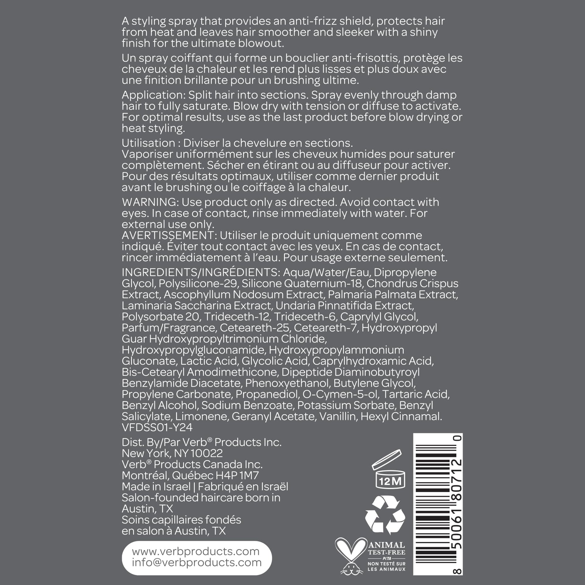 Details: Verb® Frizz Defense Smoothing Spray provides an anti-frizz shield, protects hair from heat and leaves hair smoother and sleeker with a shiny finish for the ultimate blowout.