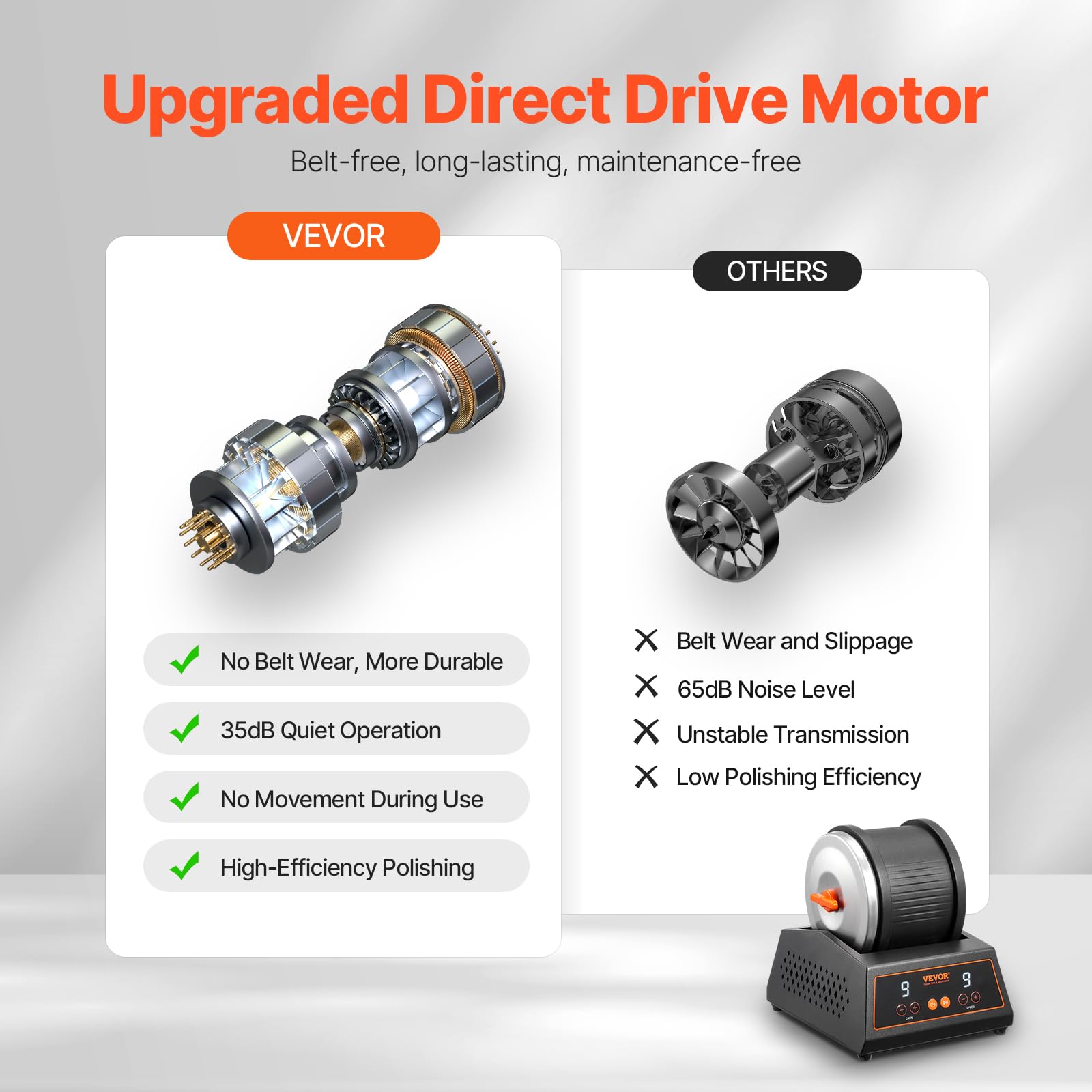 - Belt-Free Direct-Drive Motor: No more worries about broken belts! The direct-drive motor delivers efficient power with 35dB silent operation. The rock tumbler runs cool even after extended use, ensuring a longer lifespan for endless rock-tumbling fun.